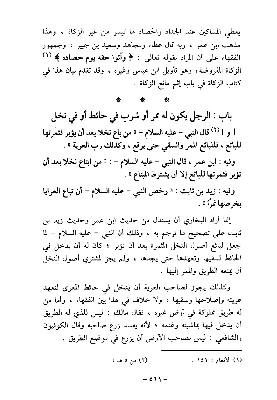 وقَالَ النَّبىُّ عليه السَّلام: (مَنْ بَاعَ نَخْلاً بَعْدَ أَنْ يُؤَبَّرَ فَثَمَرَتُهَا لِلْبَائِعِ، فَلِلْبَائِعِ الْمَمَرُّ وَالسَّقْىُ، حَتَّى يَرْفَعَ، وَكَذَلِكَ رَبُّ الْعَرِيَّةِ) . / 21 - وفيه: ابْن عُمَرَ، قَالَ النَّبِىّ، عليه السَّلام: (مَنِ ابْتَاعَ نَخْلاً بَعْدَ أَنْ تُؤَبَّرَ فَثَمَرَتُهَا لِلْبَائِعِ، إِلاَ أَنْ يَشْتَرِطَ الْمُبْتَاعُ) . / 22 - وفيه: زَيْدِ بْنِ ثَابِتٍ، رَخَّصَ النَّبِىُّ، عليه السَّلام، أَنْ تُبَاعَ الْعَرَايَا بِخَرْصِهَا تَمْرًا. إنما أراد البخارى أن يستدل من حديث ابن عمر وحديث زيد بن ثابت على تصحيح ما ترجم، وذلك أن النبى - عليه السلام - لما جعل لبائع أصول النخل المثمرة بعد أن تؤبر؛ كان له أن يدخل فى الحائط لسقيها وتعهدها حتى يجدها، ولم يجز لمشترى أصول النخل أن يمنعه الطريق والممر إليها. وكذلك يجوز لصاحب العرية أن يدخل فى حائط المعرى لتعهد عريته وإصلاحها وسقيها، ولا خلاف فى هذا بين الفقهاء، وأما من له طريق مملوكة فى أرض غيره، فقال مالك: ليس للذى له الطريق أن يدخل فيها بماشيته وغنمه؛ لأنه يفسد زرع صاحبه وقال الكوفيون والشافعى: ليس لصاحب الأرض أن يزرع فى موضع الطريق.