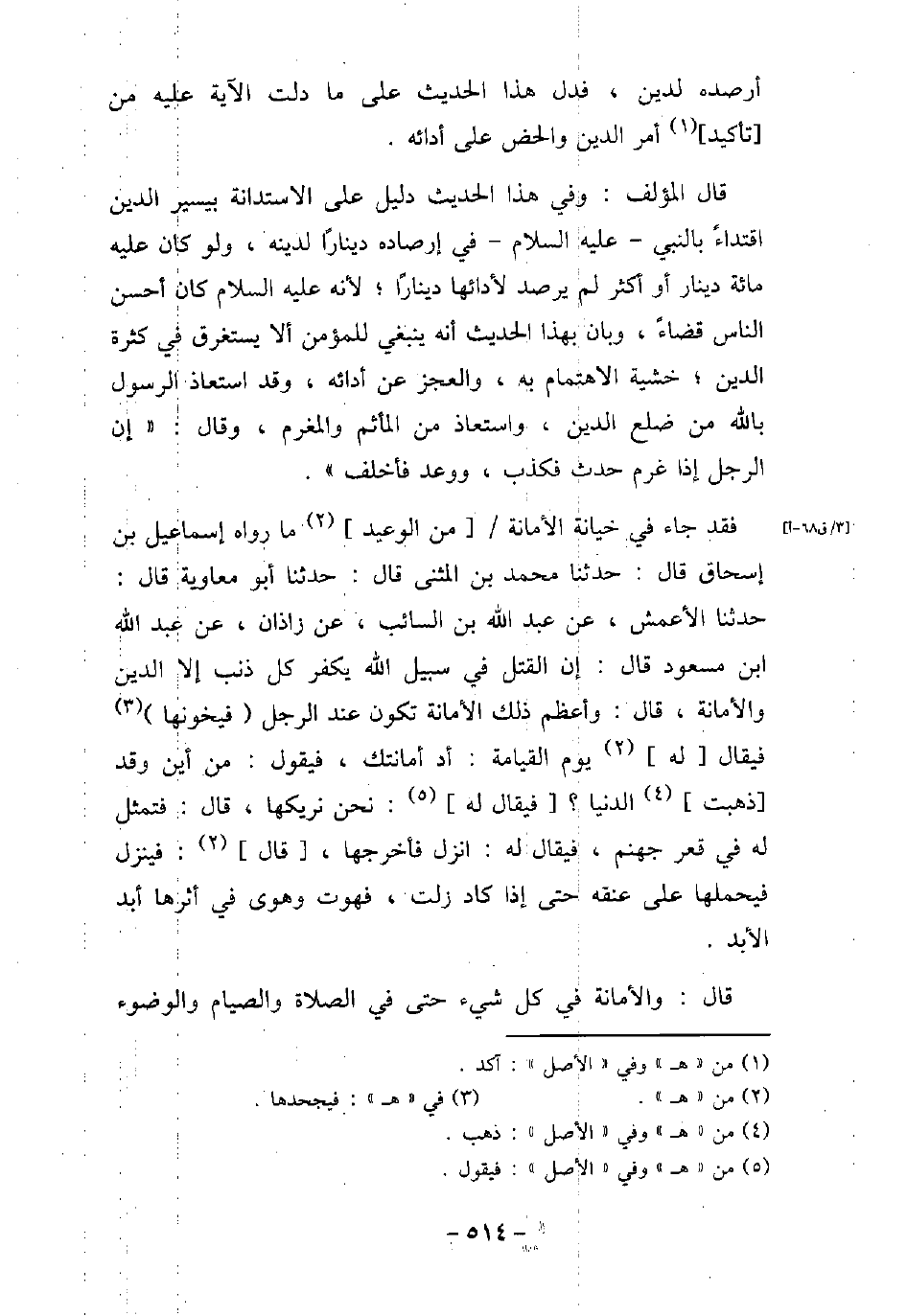 أُرْصِدُهُ لِدَيْنٍ. . . . . الحديث. قال المهلب: هذه الآية أصل فى أداء الأمانات وحفظها، ألا ترى أن النبى لم يحب أن يبقى عنده من مثل أحد ذهبًا فوق ثلاث إلا دينار أرصده لدين، فدل هذا الحديث على ما دلت الآية عليه من تأكيد أمر الدين والحض على أدائه. قال المؤلف: وفى هذا الحديث دليل على الاستدانة بيسير الدين اقتداءً بالنبى - عليه السلام - فى إرصاده دينارًا لدينه، ول كان عليه مائة دينار أو أكثر لم يرصد لأدائها دينارًا؛ لأنه عليه السلام كان أحسن الناس قضاءً، وبان بهذا الحديث أنه ينبغى للمؤمن ألا يستغرق فى كثرة الدين؛ خشية الاهتمام به، والعجز عن أدائه، وقد استعاذ الرسول بالله من ضلع الدين، واستعاذ من المأثم والمغرم، وقال: (إن الرجل إذا غرم حدث فكذب، ووعد فأخلف) . فقد جاء فى خيانة الأمانة من الوعيد ما رواه إسماعيل بن إسحاق قال: حدثنا محمد ابن المثنى قال: حدثنا أبو معاوية قال: حدثنا الأعمش، عن عبد الله بن السائب، عن زاذان، عن عبد الله بن مسعود قال: إن القتل فى سبيل الله يكفر كل ذنب إلا الدين والأمانة، قال: وأعظم ذلك الأمانة تكون عند الرجل فيخونها فيقال له يوم القيامة: أد أمانتك، فيقول: من أين وقد ذهبت الدنيا؟ فيقال له: نحن نريكها، قال: فتمثل له فى قعر جهنم، فيقال له: انزل فأخرجها، قال: فينزل فيحملها على عنقه حتى إذا كاد زلت، فهوت وهوى فى أثرها أبد الأبد. قال: والأمانة فى كل شىء حتى فى الصلاة والصيام والوضوء