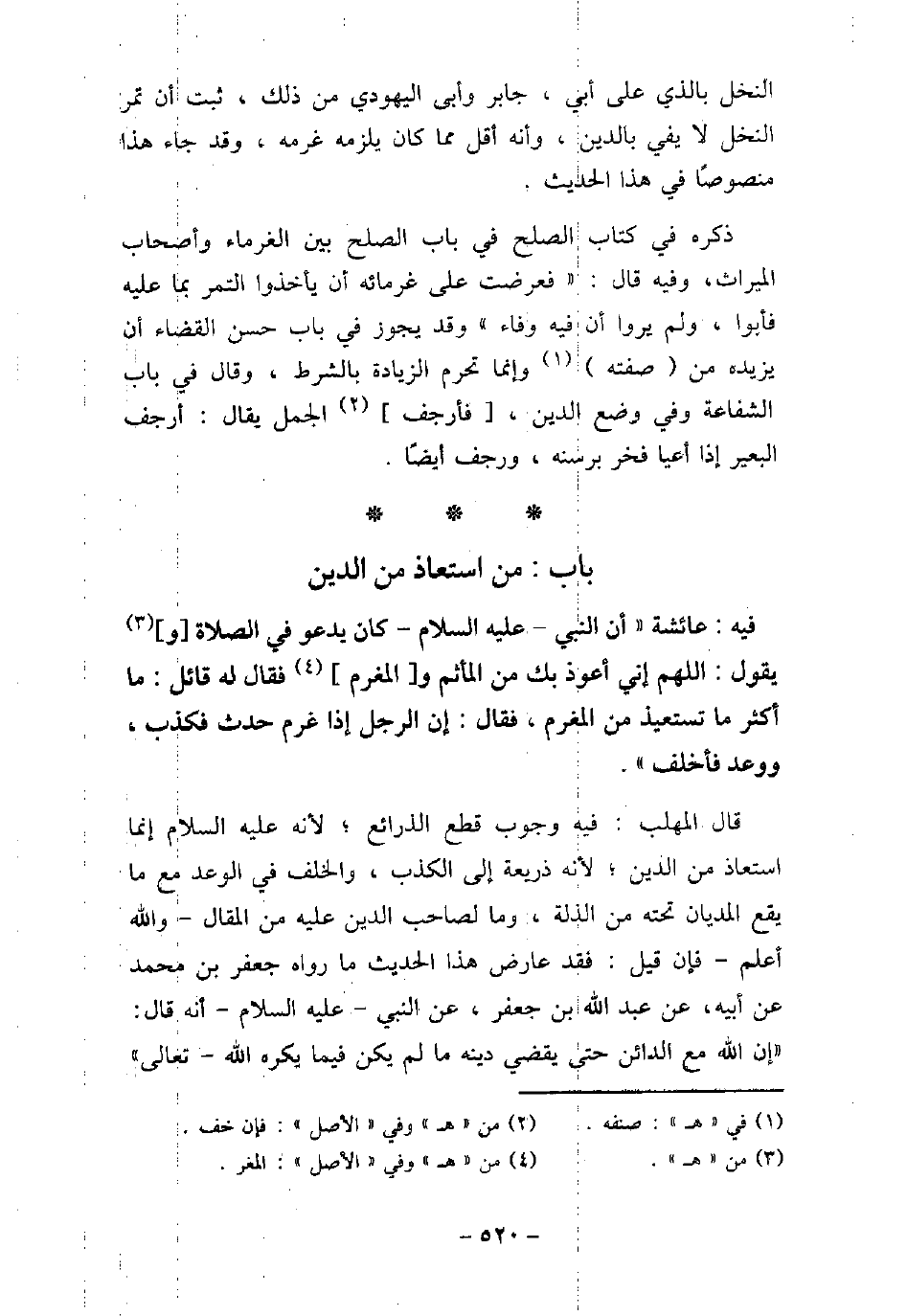 / 9 - فيه: عَائِشَةَ، أَنَّ النَّبِىّ عليه السَّلام، كَانَ يَدْعُو فِى الصَّلاَةِ، وَيَقُولُ: (اللَّهُمَّ إِنِّى أَعُوذُ بِكَ مِنَ الْمَأْثَمِ وَالْمَغْرَمِ) ، فَقَالَ لَهُ قَائِلٌ: مَا أَكْثَرَ مَا تَسْتَعِيذُ يَا رَسُولَ اللَّهِ، مِنَ الْمَغْرَمِ، قَالَ: (إِنَّ الرَّجُلَ إِذَا غَرِمَ حَدَّثَ فَكَذَبَ، وَوَعَدَ فَأَخْلَفَ) . قال المهلب: فيه وجوب قطع الذارئع؛ لأنه عليه السلام إنما استعاذ من الدين؛ لأنه ذريعة إلى الكذب، والخلف فى الوعد مع ما يقع المديان تحته من الذلة، وما لصاحب الدين عليه من المقال - والله أعلم - فإن قيل: فقد عارض هذا الحديث ما رواه جعفر ابن محمد عن أبيه، عن عبد الله بن جعفر، عن النبى - عليه السلام - أنه قال: (إن الله مع الدائن حتى يقضى دينه ما لم يكن فيما يكره الله - تعالى) ،