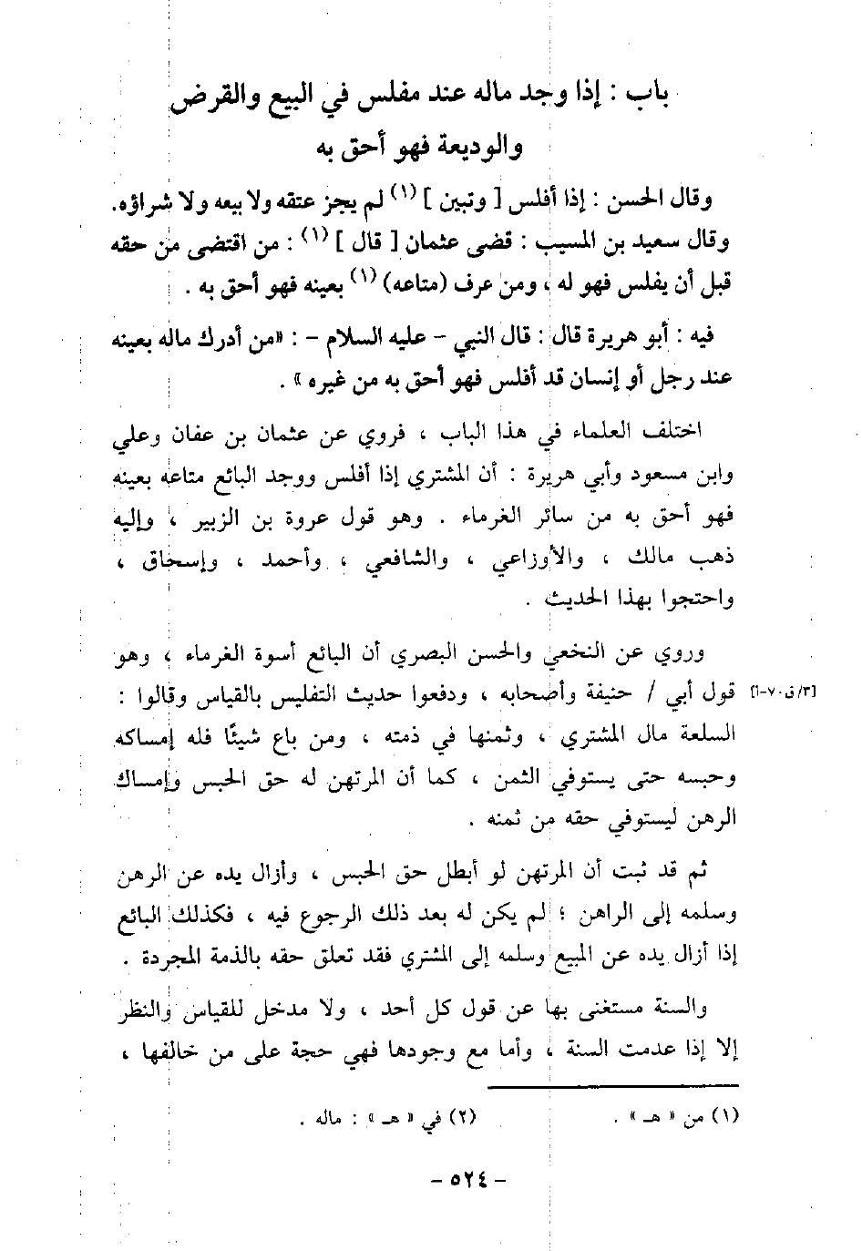 وَقَالَ الْحَسَنُ: إِذَا أَفْلَسَ وَتَبَيَّنَ لَمْ يَجُزْ عِتْقُهُ، وَلاَ بَيْعُهُ وَلاَ شِرَاؤُهُ. وَقَالَ سَعِيدُ بْنُ الْمُسَيَّبِ: قَضَى عُثْمَانُ مَنِ اقْتَضَى مِنْ حَقِّهِ قَبْلَ أَنْ يُفْلِسَ، فَهُوَ لَهُ، وَمَنْ عَرَفَ مَتَاعَهُ بِعَيْنِهِ فَهُوَ أَحَقُّ بِهِ. / 13 - فيه: أَبُو هُرَيْرَةَ، قَالَ: قال النَّبِىّ، عليه السَّلام: (مَنْ أَدْرَكَ مَالَهُ بِعَيْنِهِ عِنْدَ رَجُلٍ، أَوْ إِنْسَانٍ قَدْ أَفْلَسَ، فَهُوَ أَحَقُّ بِهِ مِنْ غَيْرِهِ) . اختلف العلماء فى هذا الباب، فروى عن عثمان بن عفان وعلى وابن مسعود وأبى هريرة: أن المشترى إذا أفلس ووجد البائع متاعه بعينه فهو أحق به من سائر الغرماء. وهو قول عروة بن الزبير، وإليه ذهب مالك، والأوزاعى، والشافعى، وأحمد، وإسحاق، واحتجوا بهذا الحديث. وروى عن النخعى والحسن البصرى أن البائع أسوة الغرماء، وهو قول أبى حنيفة وأصحابه، ودفعوا حديث التفليس بالقياس وقالوا: السلعة مال المشترى، وثمنها فى ذمته، ومن باع شيئًا فله إمساكه وحبسه حتى يستوفى الثمن، كما أن المرتهن له حق الحبس وإمساك الرهن ليستوفى حقه من ثمنه. ثم قد ثبت أن المرتهن لو أبطل حق الحبس، وأزال يده عن الرهن وسلمه إلى الراهن، لم يكن له بعد ذلك الرجوع فيه، فكذلك البائع إذا أزال يده عن المبيع وسلمه إلى المشترى فقد تعلق حقه بالذمة المجردة. والسنة مستغنى بها عن قول كل أحد، ولا مدخل للقياس والنظر إلا إذا عدمت السنة، وأما مع وجودها فهى حجة على من خالفها،