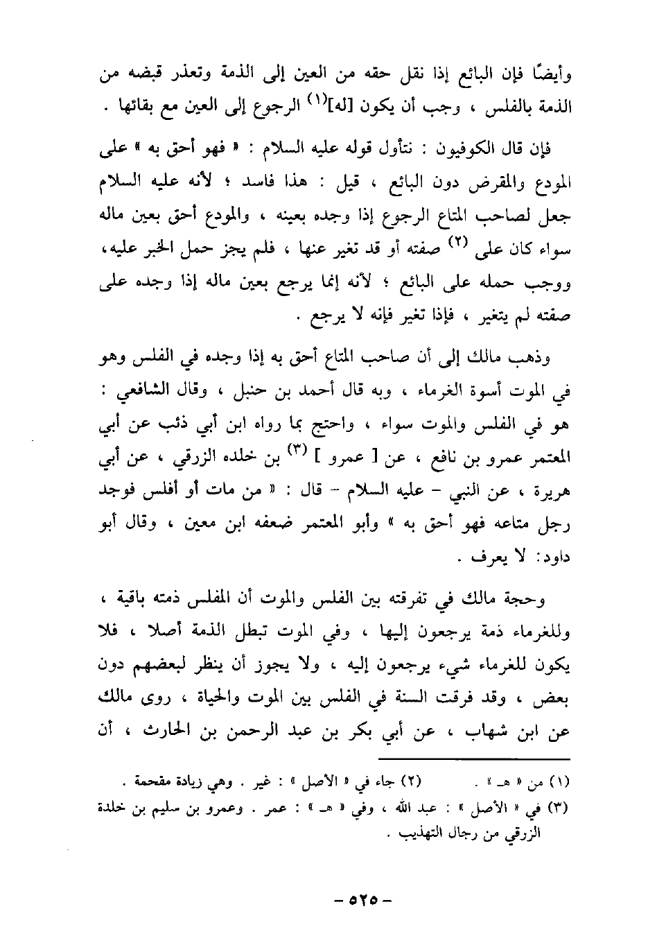 وأيضًا فإن البائع إذا نقل حقه من العين إلى الذمة وتعذر قبضه من الذمة بالفلس، وجب أن يكون له الرجوع إلى العين مع بقائها. فإن قال الكوفيون: نتأول قوله عليه السلام: (فهو أحق به) على المودع والمقرض دون البائع، قيل: هذا فاسد، لأنه عليه السلام جعل لصاحب المتاع الرجوع إذا وجده بعينه، والمودع أحق بعين ماله سواء كان على صفته أو قد تغير عنها، فلم يجز حمل الخبر عليه، ووجب حمله على البائع، لأنه إنما يرجع بعين ماله إذا وجده على صفته لم يتغير، فإذا تغير فإنه لا يرجع. وذهب مالك إلى أن صاحب المتاع أحق به إذا وجده فى الفلس وهو فى الموت أسوه الغرماء، وبه قال أحمد بن حنبل، وقال الشافعى: هو فى الفلس والموت سواء، واحتج بما رواه ابن أبى ذئب عن أبى المعتمر عمرو بن نافع، عن عمرو بن خلدة الزرقى، عن أبى هريرة، عن النبى - عليه السلام - قال: (من مات أو أفلس فوجد رجل متاعة فهو أحق به) وأبو المعتمر ضعفه ابن معين، وقال أبو داود: لا يعرف. وحجة مالك فى تفرقته بين الفلس والموت أن المفلس ذمته باقية، وللغرماء ذمة يرجعون إليها، وفى الموت تبطل الذمة أصلا، فلا يكون للغرماء شىء يرجعون إليه، ولا يجوز أن ينظر لبعضهم دون بعض، وقد فرقت السنة فى الفلس بين الموت والحياة، روى مالك عن ابن شهاب، عن أبى بكر بن عبد الرحمن بن الحارث، أن