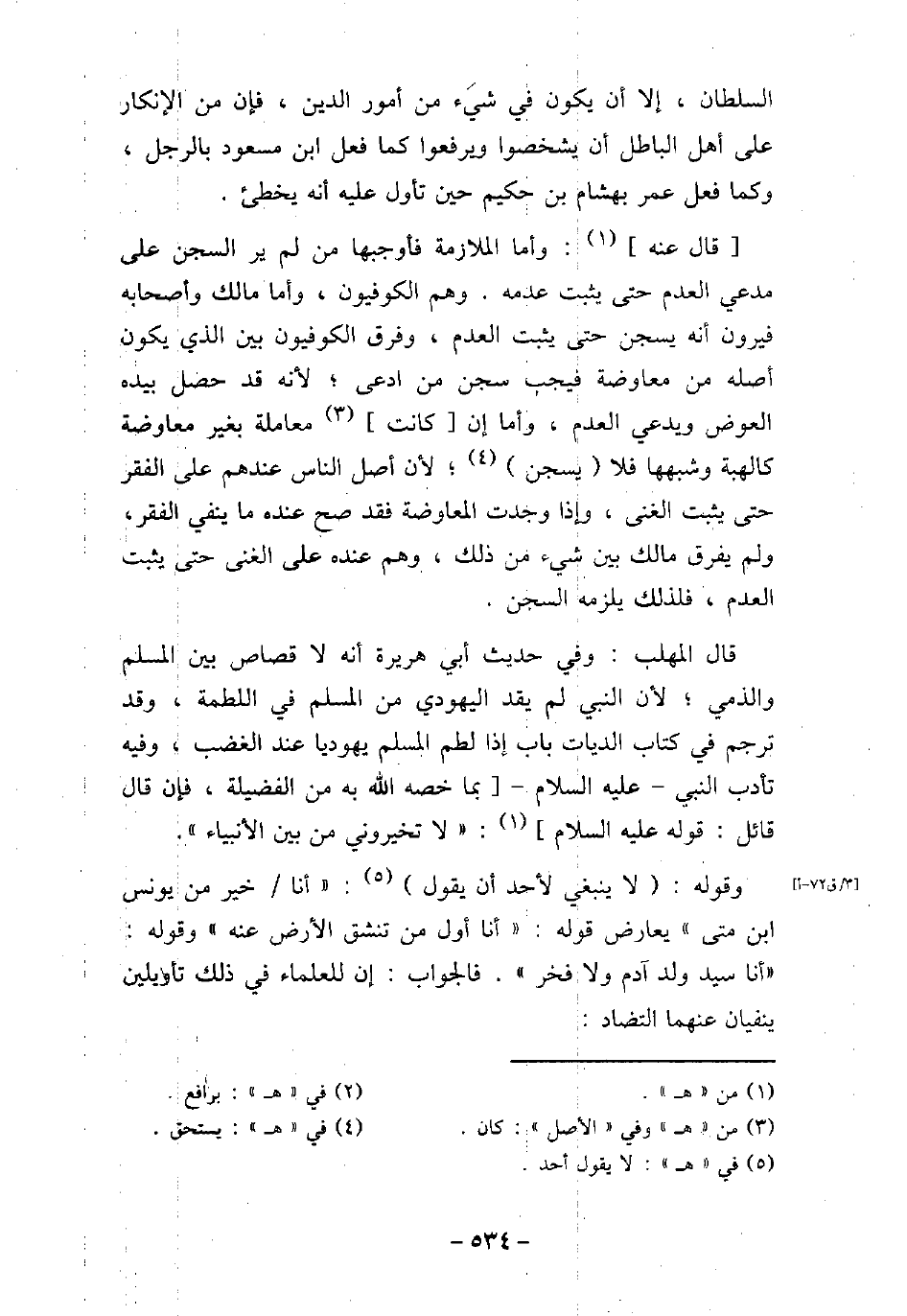 السلطان، إلا أن يكون فى شىء من أمور الدين، فإن من الإنكار على أهل الباطل أن يشخصوا ويرفعوا كما فعل ابن مسعود بالرجل، وكما فعل عمر بهشام بن حكيم حين تأول عليه أنه يخطئ. قال عنه: وأما الملازمة فأوجبها من لم ير السجن على مدعى العدم حتى يثبت عدمه. وهم الكوفيون، وأما مالك وأصحابه فيرون أنه يسجن حتى يثبت العدم، وفرق الكوفيون بين الذى يكون أصله من معاوضة فيجب سجن من ادعى، لأنه قد حصل بيده العوض ويدعى العدم، وأما إن كانت معاملة بغير معاوضة كالهبة وشبهها فلا يسجن، لأن أصل الناس عندهم على الفقر حتى يثبت الغنى، وإذا وجدت المعاوضة فقد صح عنده ما ينفى الفقر، ولم يفرق مالك بين شىء من ذلك، وهو عنده على الغنى حتى يثبت العدم، فلذلك يلزمه السجن. قال المهلب: وفى حديث أبى هريرة أنه لا قصاص بين المسلم والذمى، لأن النبى لم يقد اليهودى من المسلم فى اللطمة، وقد ترجم فى كتاب الديات باب إذا لطم المسلم يهوديا عند الغضب، وفيه تأدب النبى - عليه السلام - بما خصه الله به من الفضيلة، فإن قال قائل: قوله عليه السلام: (لا تخيرونى من بين الأنبياء) . وقوله: لا ينبغى لأحد أن يقول: (أنا خير من يونس ابن متى) يعارض قوله: (أنا أول من تنشق الأرض عنه) وقوله: (أنا سيد ولد آدم ولا فخر (. فالجواب: إن للعلماء فى ذلك تأويلين ينفيان عنهما التضاد: