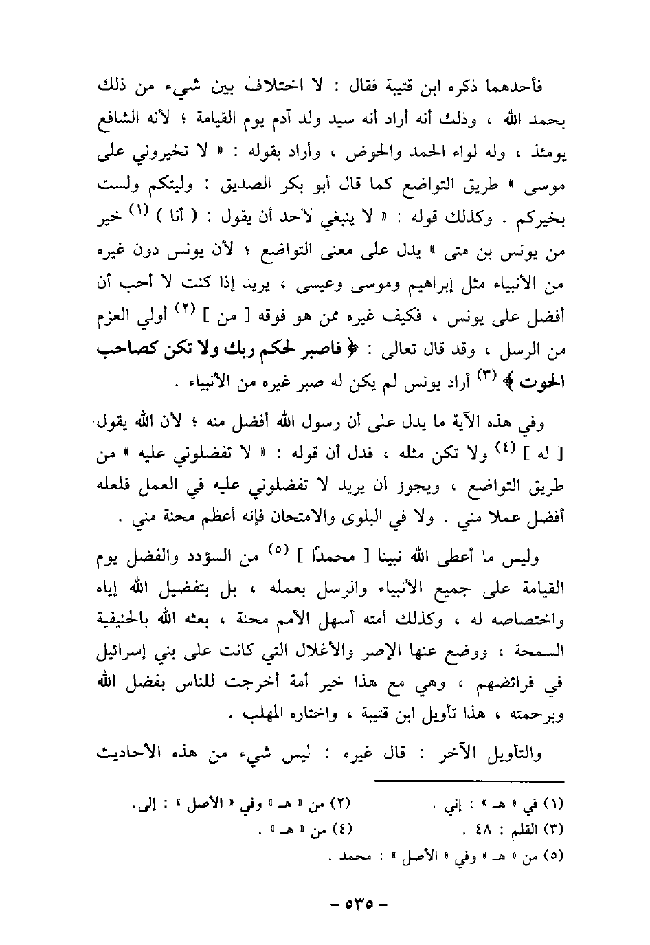 فأحدهما ذكره ابن قتيبة فقال: لا اختلاف بين شىء من ذلك بحمد الله، وذلك أنه أراد أنه سيد ولد آدم يوم القيامة، لأنه الشافع يومئذ، وله لواء الحمد والحوض، وأراد بقوله: (لا تخيرونى على موسى) طريق التواضع كما قال أبو بكر الصديق: وليتكم ولست بخيركم. وكذلك قوله: (لا ينبغى لأحد أن يقول: أنا خير من يونس بن متى) يدل على معنى التواضع، لأن يونس دون غيره من الأنبياء مثل إبراهيم وموسى وعيسى، يريد إذا كنت لا أحب أن أفضل على يونس، فكيف غيره ممن هو فوقه من أولى العزم من الرسل، وقد قال تعالى: (فاصبر لحكم ربك ولا تكن كصاحب الحوت (أراد يونس لم يكن له صبر غيره من الأنبياء. وفى هذه الآية ما يدل على أن رسول الله أفضل منه، لأن الله يقول له ولا تكن مثله، فدل أن قوله: (لا تفضلونى عليه) من طريق التواضع، ويجوز أن يريد لا تفضلونى عليه فى العمل فلعله أفضل عملا منى. ولا فى البلوى والامتحان فإنه أعظم محنة منى. وليس ما أعطى الله نبينا محمدًا من السؤدد والفضل يوم القيامة على جميع الأنبياء والرسل بعمله، بل بتفضيل الله إياه واختصاصه له، وكذلك أمته أسهل الأمم محنة، بعثه الله بالحنيفية السمحة، ووضع عنها الإصر والأغلال التى كانت على بنى إسرائيل فى فرائضهم، وهى مع هذا خير أمة أخرجت للناس بفضل الله وبرحمته، هذا تأويل ابن قتيبة، واختاره المهلب. والتأويل الآخر: قال غيره: ليس شىء من هذه الأحاديث