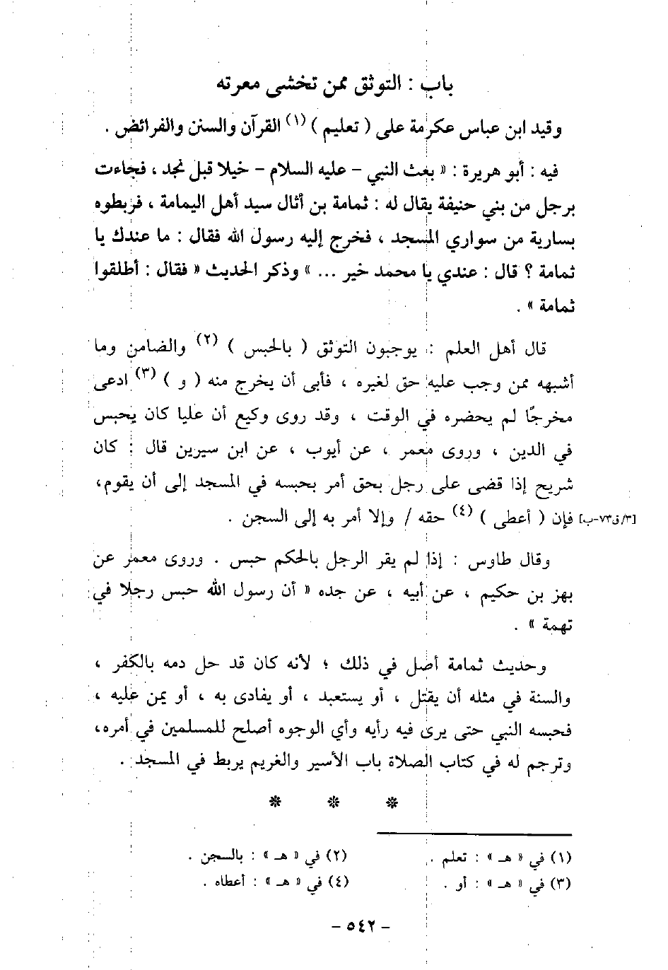 وَقَيَّدَ ابْنُ عَبَّاسٍ عِكْرِمَةَ عَلَى تَعْلِيمِ الْقُرْآنِ وَالسُّنَنِ وَالْفَرَائِضِ. / 10 - فيه: أَبُو هُرَيْرَةَ، بَعَثَ النَّبِىّ، عليه السَّلام، خَيْلاً قِبَلَ نَجْدٍ، فَجَاءَتْ بِرَجُلٍ مِنْ بَنِى حَنِيفَةَ، يُقَالُ لَهُ: ثُمَامَةُ بْنُ أُثَالٍ سَيِّدُ أَهْلِ الْيَمَامَةِ، فَرَبَطُوهُ بِسَارِيَةٍ مِنْ سَوَارِى الْمَسْجِدِ، فَخَرَجَ إِلَيْهِ رَسُولُ اللَّهِ (صلى الله عليه وسلم) ، فَقَالَ: (مَا عِنْدَكَ يَا ثُمَامَةُ) ؟ قَالَ: عِنْدِى يَا مُحَمَّدُ خَيْرٌ. . . . وَذَكَرَ الْحَدِيثَ، فَقَالَ: (أَطْلِقُوا ثُمَامَةَ) . قال أهل العلم: يوجبون التوثق بالحبس والضامن وما أشبهه ممن وجب عليه حق لغيره، فأبى أن يخرج منه وادعى مخرجًا لم يحضره فى الوقت، وقد روى وكيع أن عليا كان يحبس فى الدين، وروى معمر، عن أيوب، عن ابن سيرين قال: كان شريح إذا قضى على رجل بحق أمر بحبسه فى المسجد إلى أن يقوم، فإن أعطى حقه وإلا أمر به إلى السجن. وقال طاوس: إذا لم يقر الرجل بالحكم حبس. وروى معمر عن بهز بن حكيم، عن أبيه، عن جده (أن رسول الله حبس رجلا فى تهمة) . وحديث ثمامة أصل فى ذلك، لأنه كان قد حل دمه بالكفر، والسنة فى مثله أن يقتل، أو يستعبد، أو يفادى به، أو يمن عليه، فحبسه النبى حتى يرى فيه رأيه وأى الوجوه أصلح للمسلمين فى أمره، وترجم له فى كتاب الصلاة باب الأسير والغريم يربط فى المسجد.
