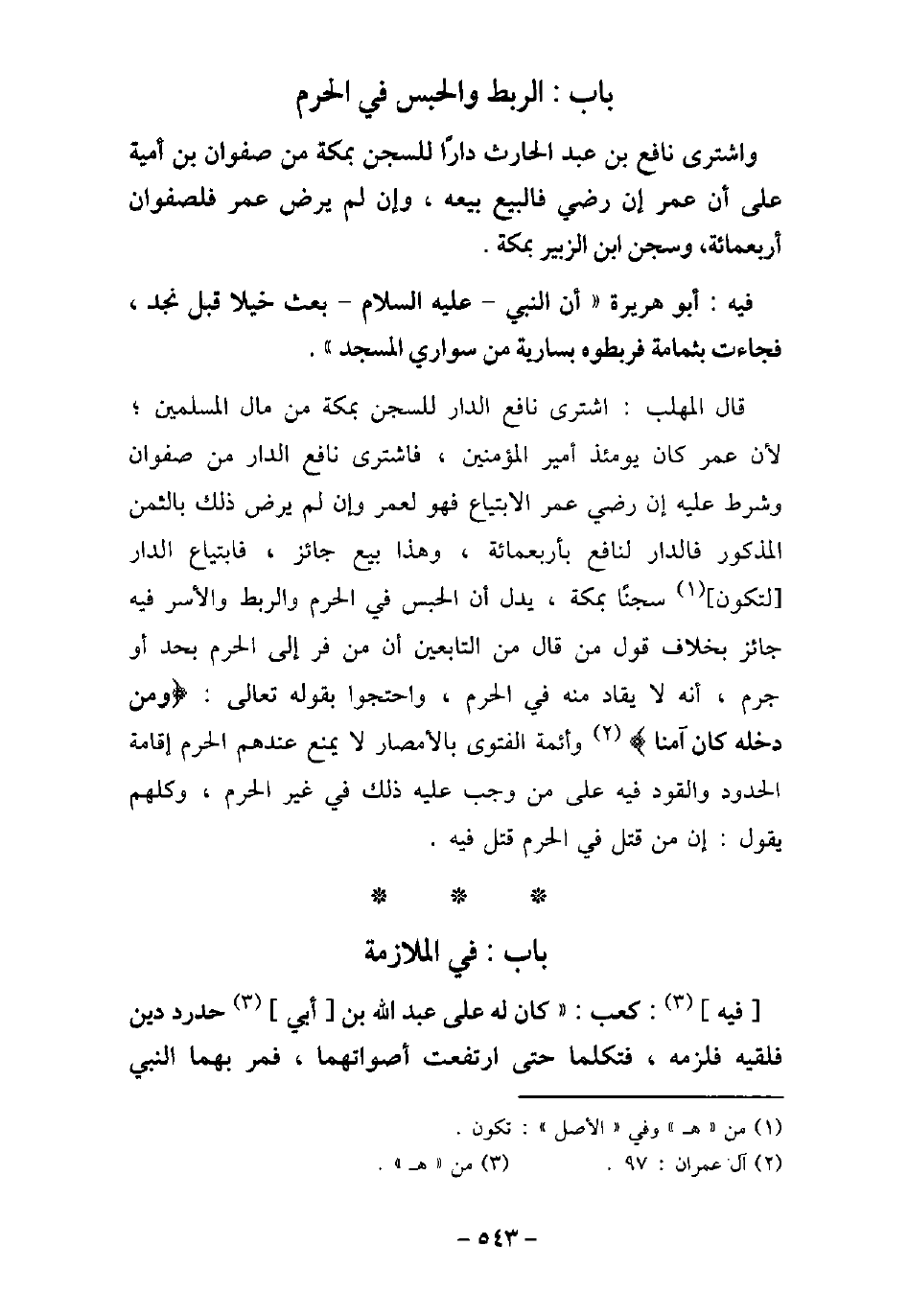 وَاشْتَرَى نَافِعُ بْنُ عَبْدِالْحَارِثِ دَارًا لِلسِّجْنِ بِمَكَّةَ مِنْ صَفْوَانَ بْنِ أُمَيَّةَ عَلَى أَنَّ عُمَرَ إِنْ رَضِىَ، فَالْبَيْعُ بَيْعُهُ، وَإِنْ لَمْ يَرْضَ عُمَرُ، فَلِصَفْوَانَ أَرْبَعُ مِائَةِ دِينَارٍ، وَسَجَنَ ابْنُ الزُّبَيْرِ بِمَكَّةَ. / 11 - فيه: أَبُو هُرَيْرَةَ، أن النَّبِىّ، عليه السَّلام، بَعَثَ خَيْلاً قِبَلَ نَجْدٍ، فَجَاءَتْ بثُمَامَة، فَرَبَطُوهُ بِسَارِيَةٍ مِنْ سَوَارِى الْمَسْجِدِ. قال المهلب: اشترى نافع الدار للسجن بمكة من مال المسلمين، لأن عمر كان يومئذ أمير المؤمنين، فاشترى نافع الدار من صفوان وشرط عليه إن رضى عمر الابتياع فهو لعمر وإن لم يرض ذلك بالثمن المذكور فالدار لنافع بأربعمائة، وهذا بيع جائز، فابتياع الدار لتكون سجنًا بمكة، يدل أن الحبس فى الحرم والربط والأسر فيه جائز بخلاف قول من قال من التابعين أن من فر إلى الحرم بحد أو جرم، أنه لا يقاد منه فى الحرم، واحتجوا بقوله تعالى: (ومن دخله كان آمنا (وأئمة الفتوى بالأمصار لا يمنع عندهم الحرم إقامة الحدود والقود فيه على من وجب عليه ذلك فى غير الحرم، وكلهم يقول: إن من قتل فى الحرم قتل فيه.