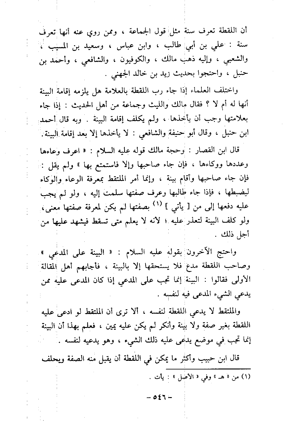 أن اللقطة تعرف سنة مثل قول الجماعة، وممن روى عنه أنها تعرف سنة: على ابن أبى طالب، وابن عباس، وسعيد بن المسيب، والشعبى، وإليه ذهب مالك، والكوفيون، والشافعى، وأحمد بن حنبل، واحتجوا بحديث زيد بن خالد الجهنى. واختلف العلماء إذا جاء رب اللقطة بالعلامة هل يلزمه إقامة البينة أنها له أم لا؟ فقال مالك والليث وجماعة من أهل الحديث: إذا جاء بعلامتها وجب أن يأخذها، ولم يكلف إقامة البينة. وبه قال أحمد بن حنبل، وقال أبو حنيفة والشافعى: لا يأخذها إلا بعد إقامة البينة. قال ابن القصار: وحجة مالك قوله عليه السلام: (اعرف وعاءها وعددها ووكاءها، فإن جاء صاحبها وإلا فاستمتع بها) ولم يقل: فإن جاء صاحبها وأقام بينة، وإنما أمر الملتقط بمعرفة الوعاء والوكاء ليضبطها، فإذا جاء طالبها وعرف صفتها سلمت إليه، ولو لم يجب عليه دفعها إلى من يأتى بصفتها لم يكن لمعرفة صفتها معنى، ولو كلف البينة لتعذر عليه، لأنه لا يعلم متى تسقط فيشهد عليها من أجل ذلك. واحتج الآخرون بقوله عليه السلام: (البينة على المدعى) ، وصاحب اللقطة مدع فلا يستحقها إلا بالبينة، فأجابهم أهل المقالة الأولى فقالوا: البينة إنما تجب على المدعى إذا كان المدعى عليه ممن يدعى الشىء المدعى فيه لنفسه. والملتقط لا يدعى اللقطة لنفسه، ألا ترى أن الملتقط لو ادعى عليه اللقطة بغير صفة ولا بينة وأنكر لم يكن عليه يمين، فعلم بهذا أن البينة إنما تجب فى موضع يدعى عليه ذلك الشىء، وهو يدعيه لنفسه. قال ابن حبيب: وأكثر ما يمكن فى اللقطة أن يقبل منه الصفة ويحلف