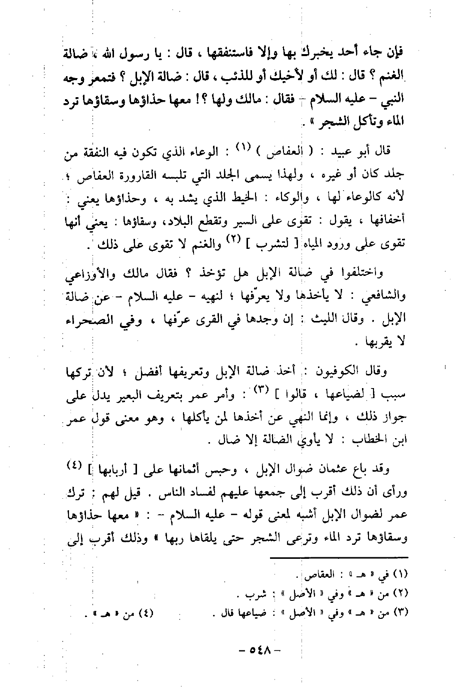 فَإِنْ جَاءَ أَحَدٌ يُخْبِرُكَ بِهَا، وَإِلاَ فَاسْتَنْفِقْهَا) ، قَالَ: يَا رَسُولَ اللَّهِ، ضَالَّةُ الْغَنَمِ؟ قَالَ: (لَكَ، أَوْ لأَخِيكَ، أَوْ لِلذِّئْبِ) ، قَالَ: ضَالَّةُ الإِبِلِ؟ فَتَمَعَّرَ وَجْهُ النَّبِىِّ، عليه السَّلام، فَقَالَ: (مَا لَكَ وَلَهَا، مَعَهَا حِذَاؤُهَا وَسِقَاؤُهَا، تَرِدُ الْمَاءَ وَتَأْكُلُ الشَّجَرَ) . قال أبو عبيد: العفاص: الوعاء الذى تكون فيه النفقة من جلد كان أو غيره، ولهذا يسمى الجلد التى تلبسه القارورة العفاص؛ لأنه كالوعاء لها، والوكاء: الخيط الذى يشد به، وحذاؤها يعنى: أخفافها، يقول: تقوى على السير وتقطع البلاد، وسقاؤها: يعنى أنها تقوى على ورود المياه لتشرب والغنم لا تقوى على ذلك. واختلفوا فى ضالة الإبل هل تؤخذ؟ قال مالك والأوزاعى والشافعى: لا يأخذها ولا يعرفها؛ لنهيه - عليه السلام - عن ضالة الإبل. وقال الليث: إن وجدها فى القرى عرفها، وفى الصحراء لا يقربها. وقال الكوفيون: أخذ ضالة الإبل وتعريفها أفضل؛ لأن تركها سبب لضياعها، قالوا: وأمر عمر بتعريف البعير يدل على جواز ذلك، وإنما النهى عن أخذها لمن يأكلها، وهو معنى قول عمر بن الخطاب: لا يأوى الضالة إلا ضال. وقد باع عثمان ضوال الإبل، وحبس أثمانها على أربابها ورأى أن ذلك أقرب إلى