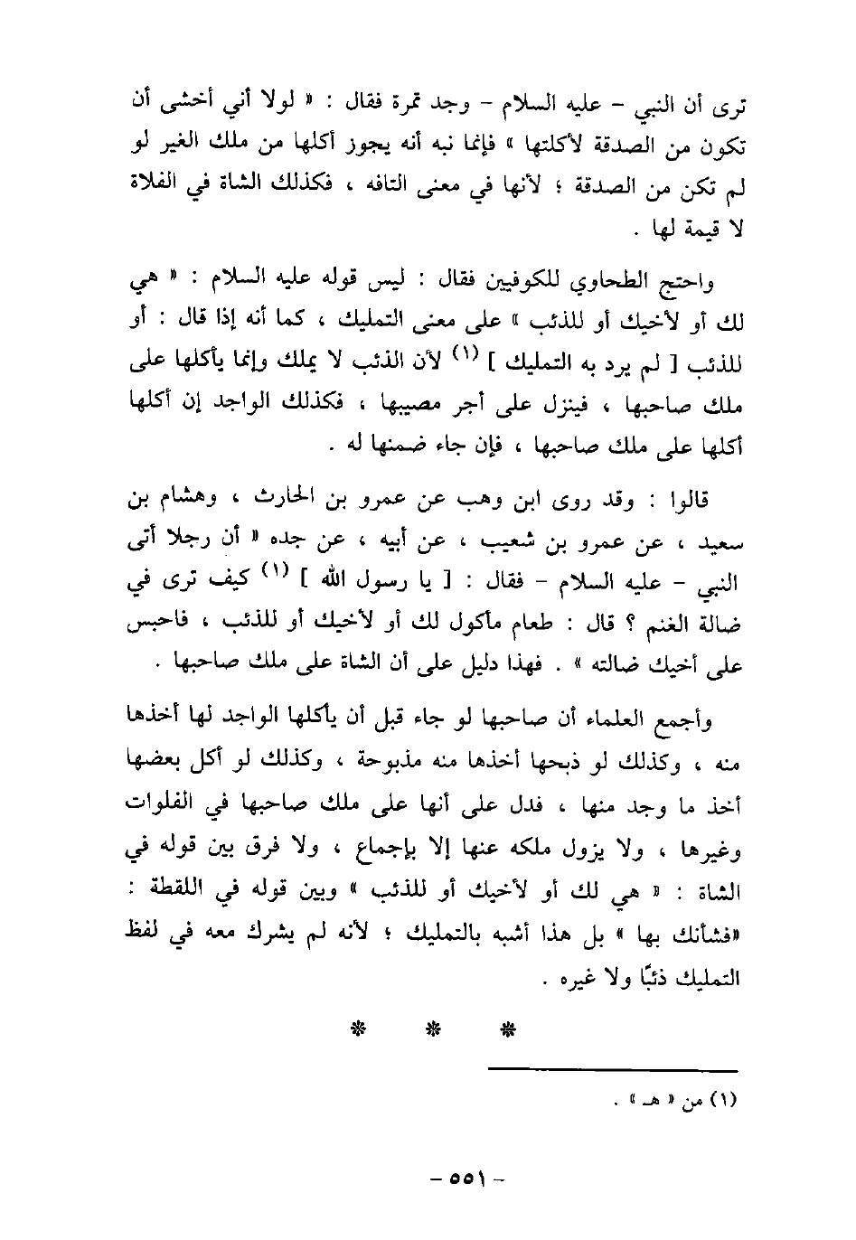 ترى أن النبى - عليه السلام - وجد تمرة فقال: (لولا أنى أخشى أن تكون من الصدقة لأكلتها) فإنما نبه أنه يجوز أكلها من ملك الغير لو لم تكن من الصدقة؛ لأنها فى معنى التافه، فكذلك الشاة فى الفلاة لا قيمة لها. واحتج الطحاوى للكوفيين فقال: ليس قوله عليه السلام: (هى لك أو لأخيك أو للذئب) على معنى التمليك، كما أنه إذا قال: أو للذئب لم يرد به التمليك لأن الذئب لا يملك وإنما يأكلها على ملك صاحبها، فينزل على أجر مصيبها، فكذلك الواجد إن أكلها، أكلها على ملك صاحبها فإن جاء ضمنها له. قالوا: وقد روى ابن وهب عن عمرو بن الحارث، وهشام بن سعيد، عن عمرو بن شعيب، عن أبيه، عن جده (أن رجلا أتى النبى - عليه السلام - فقال: يا رسول الله كيف ترى فى ضالة الغنم؟ قال: طعام مأكول لك أو لأخيك أو للذئب، فاحبس على أخيك ضالته) . فهذا دليل على أن الشاة على ملك صاحبها. وأجمع العلماء أن صاحبها لو جاء قبل أن يأكلها الواجد لها أخذها منه، وكذلك لو ذبحها أخذها منه مذبوحة، وكذلك لو أكل بعضها أخذ ما وجد منها، فدل على أنا على ملك صاحبها فى الفلوات وغيرها، ولا يزول ملكه عنها إلا بإجماع، ولا فرق بين قوله فى الشاة: (هى لك أو لأخيك أو للذئب) وبين قوله فى اللقطة: (فشأنك بها) بل هذا أشبه بالتمليك؛ لأنه لم يشرك معه فى لفظ التمليك ذئبًا ولا غيره.