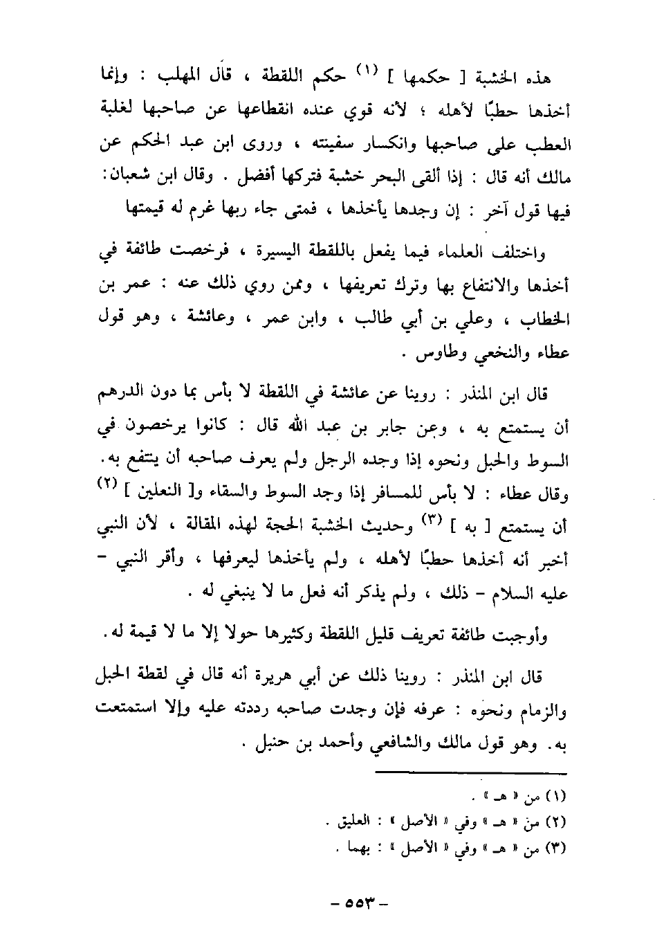 هذه الخشبة حكمها حكم اللقطة، قال المهلب: وإنما أخذها حطبًا لأهله؛ لأنه قوى عنده انقطاعها عن صاحبها لغلبة العطب على صاحبها وانكسار سفينته، وروى ابن عبد الحكم عن مالك أنه قال: إذا ألقى البحر خشبة فتركها أفضل. وقال ابن شعبان: فيها قول آخر: إن وجدها يأخذها، فمتى جاء ربها غرم له قيمتها. واختلف العلماء فيما يفعل باللقطة اليسيرة، فرخصت طائفة فى أخذها والانتفاع بها وترك تعريفها، وممن روى ذلك عنه: عمر بن الخطاب، وعلى بن أبى طالب، وابن عمر، وعائشة، وهو قول عطاء والنخعى وطاوس. قال ابن المنذر: روينا عن عائشة فى اللقطة لا بأس بما دون الدرهم أن يستمع به، وعن جابر بن عبد الله قال: كانوا يرخصون فى السوط والحبل ونحوه إذا وجده الرجل ولم يعرف صاحبه أن ينتفع به، وقال عطاء: لا بأس للمسافر إذ وجد السوط والسقاء والنعلين أن يستمتع به وحديث الخشبة الحجة لهذه المقالة، لأن النبى أخبر أنه أخذها حطبًا لأهله، ولم يأخذها ليعرفها، وأقر النبى - عليه السلام - ذلك، ولم يذكر أنه فعل ما لا ينبغى له. وأوجبت طائفة تعريف قليل اللقطة وكثيرها حولا إلا ما لا قيمة له. قال ابن المنذر: روينا ذلك عن أبى هريرة أنه قال فى لقطة الحبل والزمام ونحوه: عرفه فإن وجدت صاحبه رددته عليه إلا استمتعت به. وهو قول مالك والشافعى وأحمد ابن حنبل.