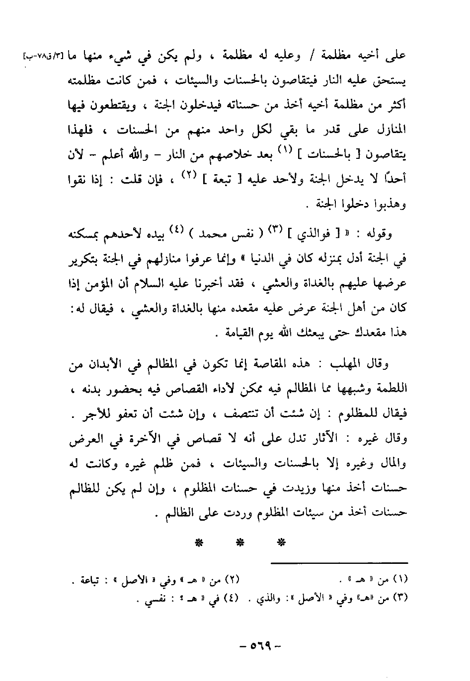 على أخيه مظلمة وعليه له مظلمة، ولم يكن فى شىء منها ما يستحق عليه النار فيتقاصون بالحسنات والسيئات، فمن كانت مظلمته أكثر من مظلمة أخيه أخذ من حسناته فيدخلون الجنة، ويقتطعون فيها المنازل على قدر ما بقى لكل واحد منهم من الحسنات، فلهذا يتقاصون بالحسنات بعد خلاصهم من النار - والله أعلم - لأن أحدًا لا يدخل الجنة ولأحد عليه تبعة، فإن قلت: إذا نقوا وهذبوا دخلوا الجنة. وقوله: (فوالذى نفس محمد بيده لأحدهم بمسكنه فى الجنة أدل بمنزله كان فى الدنيا) وإنما عرفوا منازلهم فى الجنة بتكرير عرضها عليهم بالغداة والعشى، فقد أخبرنا عليه السلام أن المؤمن إذا كان من أهل الجنة عرض عليه مقعده منها بالغداه والعشى، فيقال له: هذا مقعدك حتى يبعثك الله يوم القيامة. وقال المهلب: هذه المقاصة إنما تكون فى المظالم فى الأبدان من اللطمة وشبهها مما المظالم فيه ممكن لأداء القصاص فيه بحضور بدنه، فيقال للمظلوم: إن شئت أن تنتصف، وإن شئت أن تعفو للأجر. وقال غيره: الآثار تدل على أنه لا قصاص فى الآخرة فى العرض والمال وغيره إلا بالحسنات والسيئات، فمن ظلم غيره وكانت له حسنات أخذ منها وزيدت فى حسنات المظلوم، وإن لم يكن للظالم حسنات أخذ من سيئات المظلوم وردت على الظالم.
