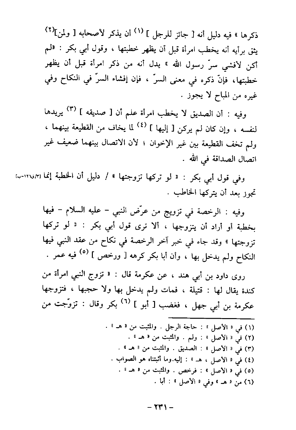 ذكرها، فيه دليل أنه جائز للرجل أن يذكر لأصحابه ولمن يثق برأيه أنه يخطب امرأة قبل أن يظهر خطبتها، وقول أبى بكر: لم أكن لأفشى سر رسول الله (صلى الله عليه وسلم) ، يدل أنه من ذكر امرأة قبل أن يظهر خطبتها، فإن ذكره فى معنى السر، فإن إفشاء السر فى النكاح وفى غيره من المباح لا يجوز. وفيه: أن الصديق لا يخطب امرأة علم أن صديقه يريدها لنفسه، وإن كان لم يركن إليها لما يخاف من القطيعة بينهما، ولم تخف القطيعة بين غير الإخوان؛ لأن الاتصال بينهما ضعيف غير اتصال الصداقة فى الله. وفى قول أبى بكر: لو تركها تزوجتها، دليل أن الخطبة إنما تجوز بعد أن يتركها الخاطب. وفيه: الرخصة فى تزويج من عرض النبى، عليه السلام، فيها بخطبة أو أراد أن يتزوجها، ألا ترى قول أبى بكر: لو تركها تزوجتها، وقد جاء فى خبر آخر الرخصة فى نكاح من عقد النبى (صلى الله عليه وسلم) فيها النكاح ولم يدخل بها، وأن أبا بكر كرهه ورخص فيه عمر. روى داود بن أبى هند، عن عكرمة، قال: تزوج النبى (صلى الله عليه وسلم) امرأة من كندة يقال لها: قتيلة، فمات ولم يدخل بها ولا حجبها، فتزوجها عكرمة بن أبى جهل، فغضب أبو بكر، وقال: تزوجت من