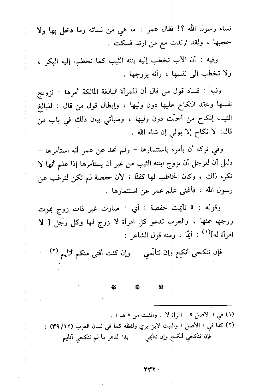 نساء رسول الله (صلى الله عليه وسلم) ؟ فقال عمر: ما هى من نسائه وما دخل بها ولا حجبها، ولقد ارتدت مع من ارتد فسكت. وفيه: أن الأب تخطب إليه بنته الثيب كما تخطب إليه البكر، ولا تخطب إلى نفسها، وأنه يزوجها. وفيه: فساد قول من قال: أن للمرأة البالغة المالكة أمرها تزويج نفسها وعقد النكاح عليها دون وليها، وإبطال قول من قال: للبالغ الثيب إنكاح من أحبت دون وليها، وسيأتى بيان ذلك فى باب من قال: لا نكاح إلا بولى إن شاء الله. وفى تركه أن يأمره باستئمارها، ولم نجد عن عمر أنه استأمرها، دليل أن للرجل أن يزوج ابنته الثيب من غير أن يستأمرها إذا علم أنها لا تكره ذلك، وكان الخاطب لها كفئًا؛ لأن حفصة لم تكن لترغب عن رسول الله (صلى الله عليه وسلم) ، فأغنى علم عمر عن استئمارها. وقوله: تأيمت حفصة، أى صارت غير ذات زوج بموت زوجها عنها، والعرب تدعو كل امرأة لا زوج لها وكل رجل لا امرأة له: أيمًا، ومنه قول الشاعر: فإن تنكحى أنكح وإن تتأيمى وإن كنت أفتى منكم أتأيم
