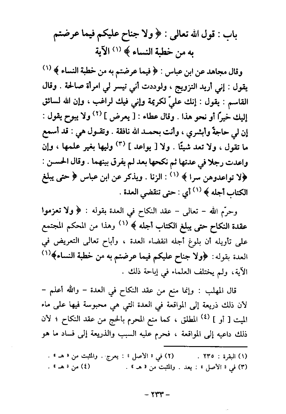 وَقَالَ مُجَاهِد، عَنِ ابْنِ عَبَّاسٍ: (فِيمَا عَرَّضْتُمْ بِهِ مِنْ خِطْبَةِ النِّسَاءِ (يَقُولُ: إِنِّى أُرِيدُ التَّزْوِيجَ، وَلَوَدِدْتُ أَنَّهُ تَيَسَّرَ لِى امْرَأَةٌ صَالِحَةٌ. وَقَالَ الْقَاسِمُ: يَقُولُ: إِنَّكِ عَلَىَّ لَكَرِيمَةٌ، وَإِنِّى فِيكِ لَرَاغِبٌ، وَإِنَّ اللَّهَ لَسَائِقٌ إِلَيْكِ خَيْرًا - أَوْ نَحْوَ هَذَا - وَقَالَ عَطَاءٌ: يُعَرِّضُ وَلا يَبُوحُ، يَقُولُ: إِنَّ لِى حَاجَةً، وَأَبْشِرِى وَأَنْتِ بِحَمْدِ اللَّهِ نَافِقَةٌ. وَتَقُولُ هِىَ: قَدْ أَسْمَعُ مَا تَقُولُ، وَلا تَعِدُ شَيْئًا، وَلا يُوَاعِدُ وَلِيُّهَا بِغَيْرِ عِلْمِهَا، وَإِنْ وَاعَدَتْ رَجُلا فِى عِدَّتِهَا، ثُمَّ نَكَحَهَا بَعْدُ لَمْ يُفَرَّقْ بَيْنَهُمَا. وَقَالَ الْحَسَنُ: (لا تُوَاعِدُوهُنَّ سِرًّا (: الزِّنَا. وَيُذْكَرُ عَنِ ابْنِ عَبَّاسٍ: (حَتَّى يَبْلُغَ الْكِتَابُ أَجَلَهُ (: تَنْقَضِىَ الْعِدَّةُ. وحرم الله تعالى عقد النكاح فى العدة بقوله: (ولا تعزموا عقدة النكاح حتى يبلغ الكتاب أجله) [البقرة: 235] ، وهذا من المحكم المجتمع على تأويله أن بلوغ أجله انقضاء العدة، وأباح تعالى التعريض فى العدة بقوله: (ولا جناح عليكم فيما عرضتم به من خطبة النساء) [البقرة: 235] الآية، ولم يختلف العلماء فى إباحة ذلك. قال المهلب: وإنما منع من عقد النكاح فى العدة، والله أعلم؛ لأن ذلك ذريعة إلى المواقعة فى العدة التى هى محبوسة فيها على ماء الميت أو المطلق، كما منع المحرم بالحج من عقد النكاح؛ لأن ذلك داعيه إلى المواقعة، فحرم عليه السبب والذريعة إلى فساد ما هو