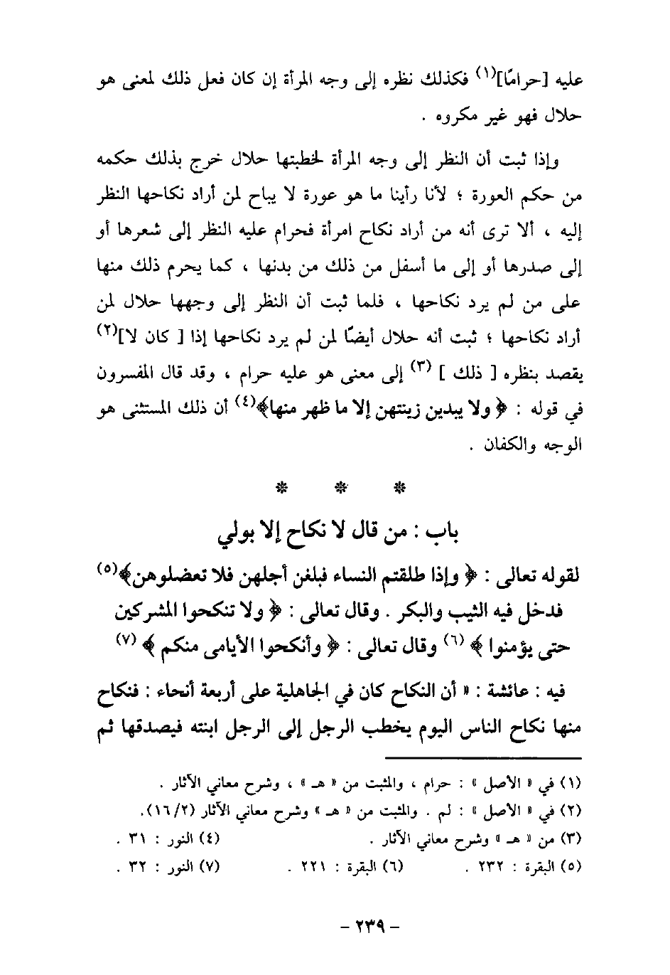 عليه حرامًا، فكذلك نظره إلى وجه المرأة إن كان فعل ذلك لمعنى هو حلال فهو غير مكروه. وإذا ثبت أن النظر إلى وجه المرأة لخطبتها حلال خرج بذلك حكمه من حكم العورة؛ لأنا رأينا ما هو عورة لا يباح لمن أراد نكاحها النظر إليه، ألا ترى أنه من أراد نكاح امرأة فحرام عليه النظر إلى شعرها أو إلى صدرها أو إلى ما أسفل من ذلك من بدنها، كما يحرم ذلك منها على من لم يرد نكاحها، فلما ثبت أن النظر إلى وجهها حلال لمن أراد نكاحها، ثبت أنه حلال أيضًا لمن لم يرد نكاحها إذا كان لا يقصد بنظره ذلك إلى معنى هو عليه حرام، وقد قال المفسرون فى قوله: (ولا يبدين زينتهن إلا ما ظهر منها) [النور: 31] ، أن ذلك المستثنى هو الوجه والكفان.
