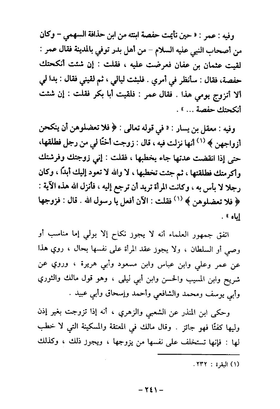 / 25 - وفيه: عُمَر، حِينَ تَأَيَّمَتْ حَفْصَةُ بِنْتُ عُمَرَ مِنِ ابْنِ حُذَافَةَ السَّهْمِىِّ، وَكَانَ مِنْ أَصْحَابِ النَّبِىِّ، عَلَيْهِ السَّلام، مِنْ أَهْلِ بَدْرٍ تُوُفِّىَ بِالْمَدِينَةِ، فَقَالَ عُمَرُ: لَقِيتُ عُثْمَانَ بْنَ عَفَّانَ، فَعَرَضْتُ عَلَيْهِ، فَقُلْتُ: إِنْ شِئْتَ أَنْكَحْتُكَ حَفْصَةَ، فَقَالَ: سَأَنْظُرُ فِى أَمْرِى، فَلَبِثْتُ لَيَالِىَ، ثُمَّ لَقِيَنِى، فَقَالَ: بَدَا لِى أَنْ لا أَتَزَوَّجَ يَوْمِى هَذَا، فَقَالَ عُمَرُ: فَلَقِيتُ أَبَا بَكْرٍ، فَقُلْتُ: إِنْ شِئْتَ أَنْكَحْتُكَ حَفْصَةَ. . . . / 26 - وفيه: مَعْقِلُ بْنُ يَسَارٍ فِى قوله تَعَالَى: (فَلا تَعْضُلُوهُنَّ أَن يَنكِحْنَ أَزْوَاجَهُنَّ (أَنَّهَا نَزَلَتْ فِيهِ، قَالَ: زَوَّجْتُ أُخْتًا لِى مِنْ رَجُلٍ فَطَلَّقَهَا، حَتَّى إِذَا انْقَضَتْ عِدَّتُهَا جَاءَ يَخْطُبُهَا، فَقُلْتُ لَهُ: إنى زَوَّجْتُكَ وَفَرَشْتُكَ وَأَكْرَمْتُكَ فَطَلَّقْتَهَا، ثُمَّ جِئْتَ تَخْطُبُهَا، لا وَاللَّهِ، لا تَعُودُ إِلَيْكَ أَبَدًا، وَكَانَ رَجُلا لا بَأْسَ بِهِ، وَكَانَتِ الْمَرْأَةُ تُرِيدُ أَنْ تَرْجِعَ إِلَيْهِ، فَأَنْزَلَ اللَّهُ هَذِهِ الآيَةَ: (فَلا تَعْضُلُوهُنَّ (، فَقُلْتُ: الآنَ أَفْعَلُ يَا رَسُولَ اللَّهِ، قَالَ: فَزَوَّجَهَا إِيَّاهُ. اتفق جمهور العلماء أنه لا يجوز نكاح إلا بولى إما مناسب أو وصى أو السلطان، ولا يجوز عقد المرأة على نفسها بحال، روى هذا عن عمر، وعلى، وابن عباس، وابن مسعود، وأبى هريرة، وروى عن شريح، وابن المسيب، والحسن، وابن أبى ليلى، وهو قول مالك، والثورى، وأبى يوسف، ومحمد، والشافعى، وأحمد، وإسحاق، وأبى عبيد. وحكى ابن المنذر، عن الشعبى، والزهرى أنه إذا تزوجت بغير إذن وليها كفئًا فهو جائز. وقال مالك فى المعتقة والمسكينة التى لا خطب لها، فإنها تستخلف على نفسها من يزوجها، ويجوز ذلك، وكذلك