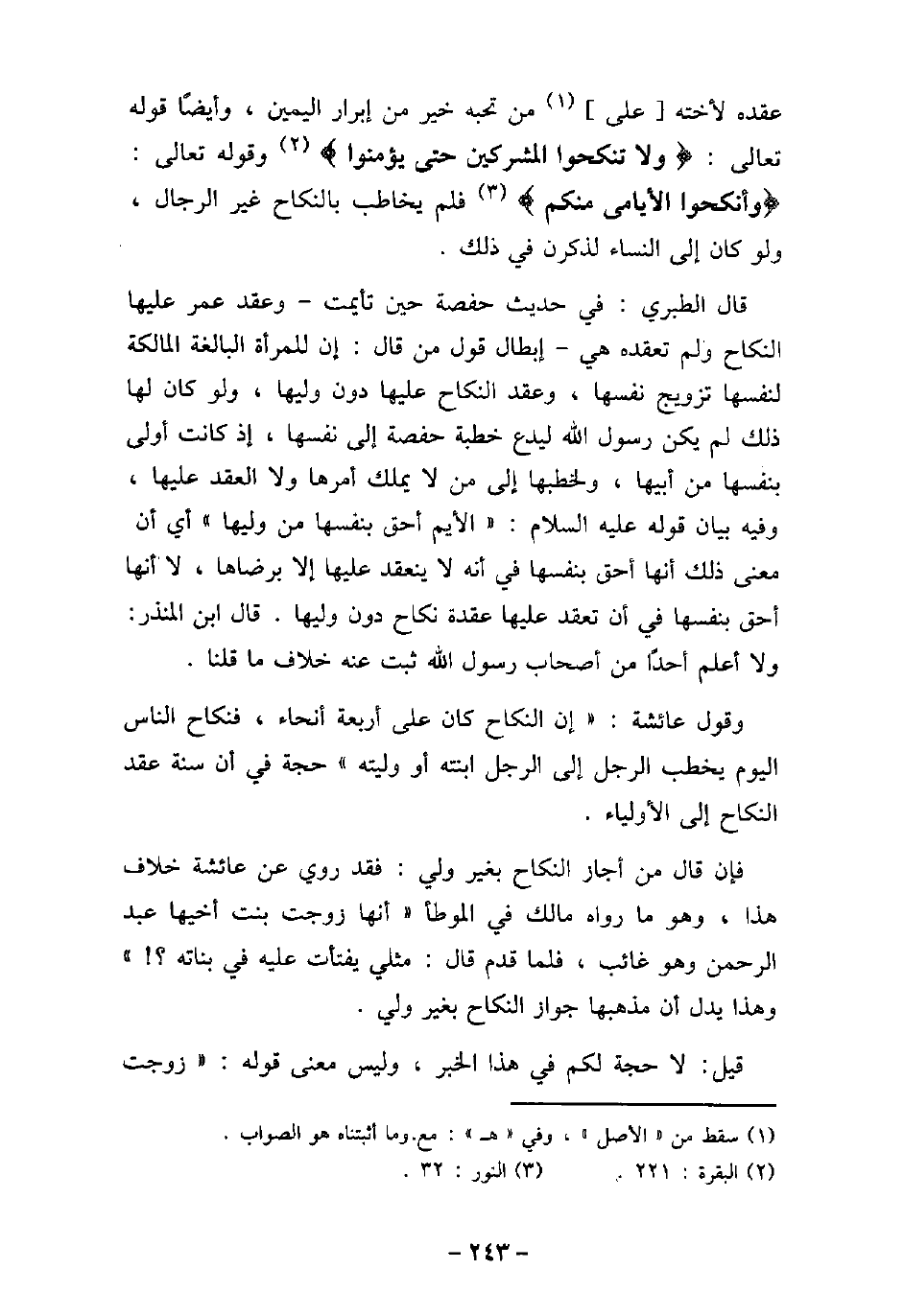 عقده لأخته على من تحبه خير من إبرار اليمين، وأيضًا قوله تعالى: (ولا تنكحوا المشركين حتى يؤمنوا) [البقرة: 221] ، وقوله تعالى: (وأنكحوا الأيامى منكم) [النور: 32] ، فلم يخاطب بالنكاح غير الرجال، ولو كان على النساء لذكرن فى ذلك. قال الطبرى: فى حديث حفصة حين تأيمت، وعقد عمر عليها النكاح ولم تعقده هى، إبطال قول من قال: إن للمرأة البالغة المالكة لنفسها تزويج نفسها، وعقد النكاح عليها دون وليها، ولو كان لها ذلك لم يكن رسول الله (صلى الله عليه وسلم) ليدع خطبة حفصة إلى نفسها، إذ كانت أولى بنفسها من أبيها، ولخطبها إلى من لا يملك أمرها ولا العقد عليها، وفيه بيان قوله عليه السلام: (الأيم أحق بنفسها من وليها) ، أى أن معنى ذلك أنها أحق بنفسها فى أنه لا ينعقد عليها إلا برضاها، لا أنها أحق بنفسها فى أن تعقد عليها عقدة نكاح دون وليها. قال ابن المنذر: ولا أعلم أحدًا من أصحاب رسول الله (صلى الله عليه وسلم) ثبت عنه خلاف ما قلنا. وقول عائشة: إن النكاح كان على أربعة أنحاء، فنكاح الناس اليوم يخطب الرجل إلى الرجل ابنته أو وليته، حجة فى أن سنة عقد النكاح إلى الأولياء. فإن قال من أجاز بغير ولى: فقد روى عن عائشة خلاف هذا، وهو ما رواه مالك فى الموطأ أنها زوجت بنت أخيها عبد الرحمن وهو غائب، فلما قدم قال: مثلى يفتأت عليها فى بناته؟ وهذا يدل أن مذهبها جواز النكاح بغير ولى. قيل: لا حجة لكم فى هذا الخبر، وليس معنى قوله: زوجت