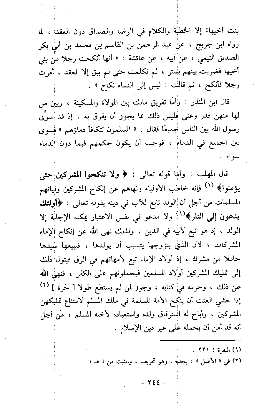 بنت أخيها، إلا الخطبة، والكلام فى الرضا والصداق دون العقد، لما رواه ابن جريج، عن عبد الرحمن بن القاسم ابن محمد بن أبى بكر الصديق التيمى، عن أبيه، عن عائشة، أنها أنكحت رجلاً من بنى أخيها، فضربت بينهم بستر، ثم تكلمت حتى لم يبق إلا العقد، أمرت رجلاً فأنكح، ثم قالت: ليس إلى النساء نكاح. قال ابن المنذر: وأما تفريق مالك بين المولاة والمسكينة، وبين من لها منهن قدر وغنى، فليس ذلك مما يجوز أن يفرق به، إذ قد سوى رسول الله (صلى الله عليه وسلم) بين الناس جميعًا، فقال: (المسلمون تتكافأ دماؤهم) ، فسوى بين الجميع فى الدماء، فوجب أن يكون حكمهم فيما دون الدماء سواء. قال المهلب: وأما قوله تعالى: (ولا تنكحوا المشركين حتى يؤمنوا) [البقرة: 221] ، فإنه خاطب الأولياء ونهاهم عن إنكاح المشركين ولياتهم المسلمات من أجل أن الولد تابع للأب فى دينه بقوله تعالى: (أولئك يدعون إلى النار) [البقرة: 221] ، ولا مدعو فى نفس الاعتبار يمكنه الإجابة إلا الولد، إذ هو تبع لأبيه فى الدين، ولذلك نهى الله عن إنكاح الإماء المشركات؛ لأن الذى يتزوجها يتسبب أن يولدها، فيبيعها سيدها حاملاً من مشرك، إذ أولاد الإماء تبع لأمهاتهم فى الرق فيئول ذلك إلى تمليك المشركين أولاد المسلمين فيحملونهم على الكفر، فنهى الله عن ذلك، وحرمه فى كتابه، وجوز لمن لم يستطع طولاً لحرة إذا خشى العنت أن ينكح الأمة المسلمة فى ملك المسلم لامتناع تمليكهن المشركين، وأباح له استرقاق ولده واستعباده لأخيه المسلم، من أجل أنه قد أمن أن يحمله على غير دين الإسلام.
