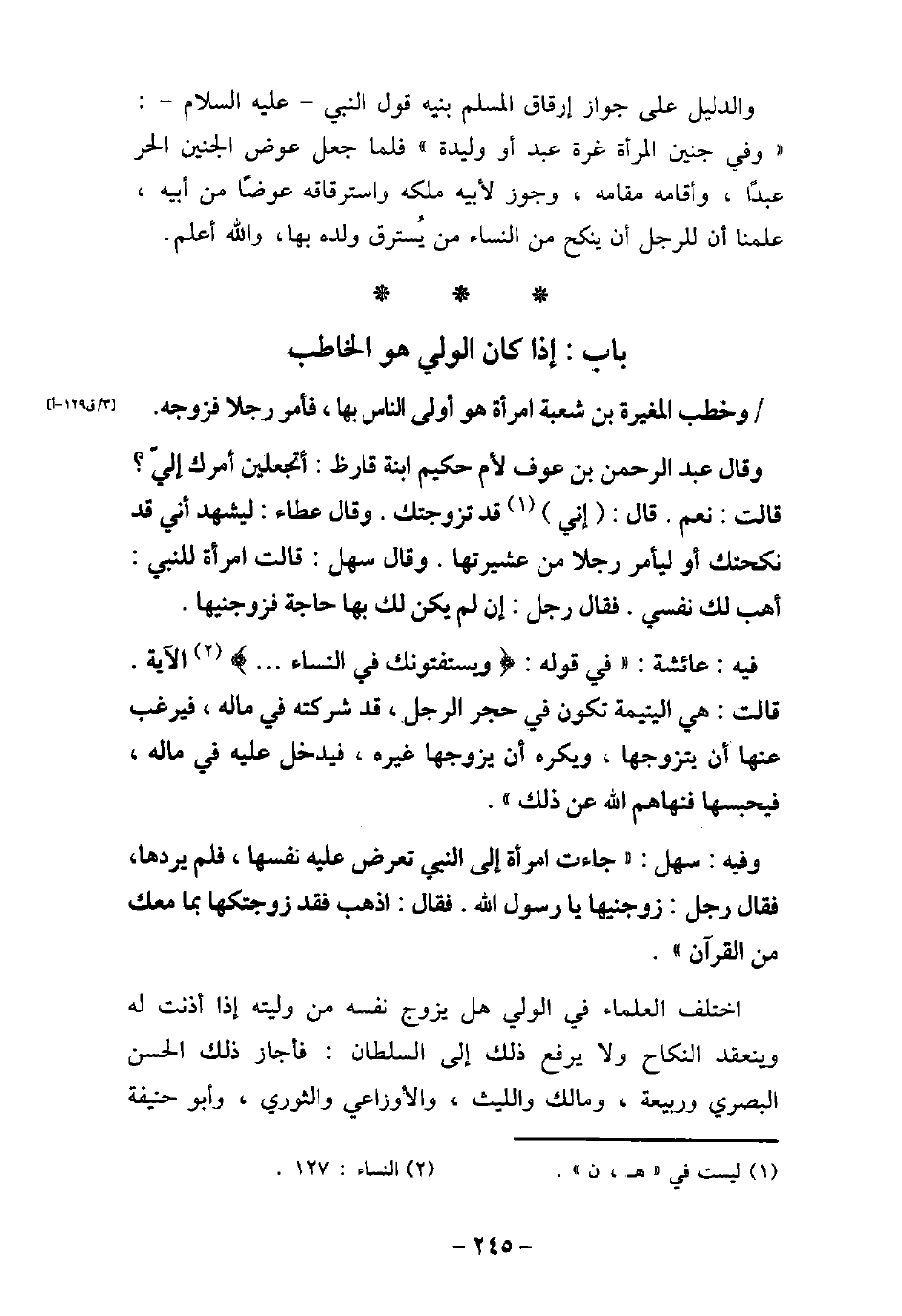 وَخَطَبَ الْمُغِيرَةُ بْنُ شُعْبَةَ امْرَأَةً هُوَ أَوْلَى النَّاسِ بِهَا، فَأَمَرَ رَجُلا فَزَوَّجَهُ، وَقَالَ عَبْدُالرَّحْمَنِ بْنُ عَوْفٍ لأمِّ حَكِيمٍ ابْنَة قَارِظٍ: أَتَجْعَلِينَ أَمْرَكِ إِلَىَّ؟ قَالَتْ: نَعَمْ، فَقَالَ: قَدْ زَوَّجْتُكِ، وَقَالَ عَطَاءٌ: لِيُشْهِدْ أَنِّى قَدْ نَكَحْتُكِ، أَوْ لِيَأْمُرْ رَجُلا مِنْ عَشِيرَتِهَا. وَقَالَ سَهْلٌ: قَالَتِ امْرَأَةٌ لِلنَّبِىِّ (صلى الله عليه وسلم) : أَهَبُ لَكَ نَفْسِى، فَقَالَ رَجُلٌ: يَا رَسُولَ اللَّهِ، إِنْ لَمْ تَكُنْ لَكَ بِهَا حَاجَةٌ فَزَوِّجْنِيهَا. / 27 - فيه: عَائِشَةَ، فِى قَوْلِهِ: (وَيَسْتَفْتُونَكَ فِى النِّسَاءِ (الآيَةِ، قَالَتْ: هِىَ الْيَتِيمَةُ، تَكُونُ فِى حَجْرِ الرَّجُلِ قَدْ شَرِكَتْهُ فِى مَالِهِ، فَيَرْغَبُ عَنْهَا أَنْ يَتَزَوَّجَهَا، وَيَكْرَهُ أَنْ يُزَوِّجَهَا غَيْرَهُ، فَيَدْخُلَ عَلَيْهِ فِى مَالِهِ، فَيَحْبِسُهَا، فَنَهَاهُمُ اللَّهُ عَنْ ذَلِكَ. / 28 - وفيه: سَهْلُ، جَاءَت امْرَأَةٌ إلى النَّبِىّ تَعْرِضُ عَلَيْهِ نَفْسَهَا، فَلَمْ يُرِدْهَا، فَقَالَ رَجُلٌ: زَوِّجْنِيهَا يَا رَسُولَ اللَّهِ؛ فَقَالَ: (اذْهَبْ، فَقَدْ زَوَّجْتُكَهَا بِمَا مَعَكَ مِنَ الْقُرْآنِ) . اختلف العلماء فى الولى هل يزوج نفسه من وليته إذا أذنت له وينعقد النكاح ولا يرفع ذلك إلى السلطان، فأجاز ذلك الحسن البصرى، وربيعة، ومالك، والليث، والأوزاعى، والثورى، وأبو حنيفة،