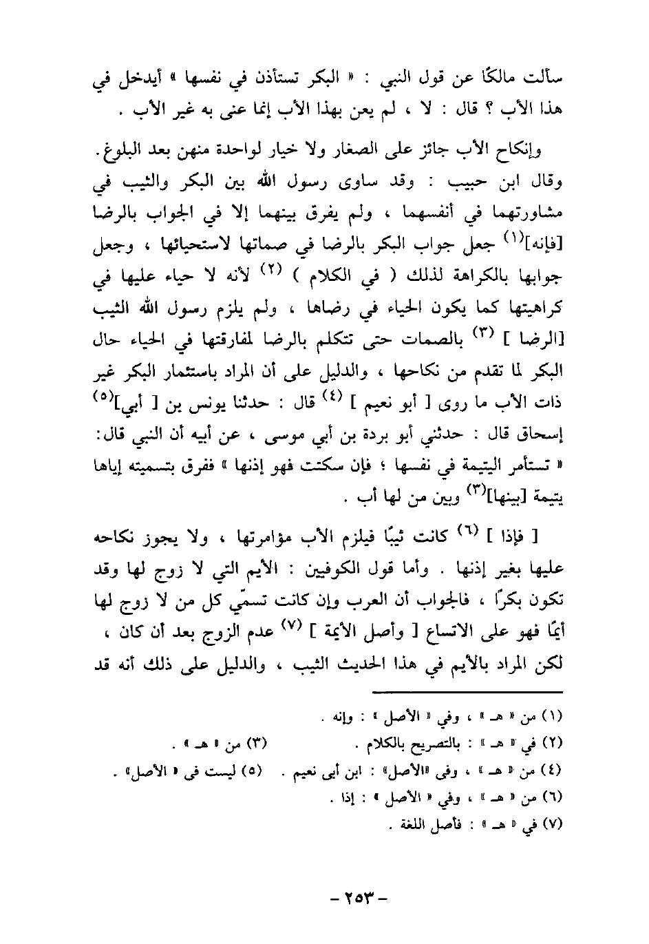 سألت مالكًا عن قول النبى (صلى الله عليه وسلم) : (البكر تستأذن فى نفسها) ، أيدخل فى هذا الأب؟ قال: لا، لم يعن بهذا الأب إنما عنى به غير الأب. وإنكاح الأب جائز على الصغار ولا خيار لواحدة منهن بعد البوغ. وقال ابن حبيب: وقد ساوى رسول الله (صلى الله عليه وسلم) بين البكر والثيب فى مشاورتهما فى أنفسهما، ولم يفرق بينهما إلا فى الجواب بالرضا، فإنه جعل جواب البكر بالرضا فى صماتها لاستحيائها، وجعل جوابها بالكراهة لذلك فى الكلام؛ لأنه لا حياء عليها فى كراهيتها كما يكون الحياء فى رضاها، ولم يلزم رسول الله (صلى الله عليه وسلم) الثيب الرضا بالصمات حتى تتكلم بالرضا لمفارقتها فى الحياء حال البكر لما تقدم من نكاحها، والدليل على أن المراد باستئمار البكر غير ذات الأب ما روى أبو نعيم، قال: حدثنا يونس بن أبى إسحاق، قال: حدثنى أبو بردة بن أبى موسى، عن أبيه، أن النبى (صلى الله عليه وسلم) قال: (تستأمر اليتيمة فى نفسها، فإن سكتت فهو إذنها) ، ففرق بتسميته إياها يتيمة بينها وبين من لها أب. فإذا كانت ثيبًا، فيلزم الأب مؤامرتها، ولا يجوز نكاحه عليها بغير إذنها. وأما قول الكوفيين: الأيم التى لا زوج لها وقد تكون بكرًا، فالجواب أن العرب وإن كانت تسمى كل من لا زوج لها أيمًا فهو على الاتساع وأصل الأيمة عدم الزوج بعد أن كان، لكن المراد بالأيم فى هذا الحديث الثيب، والدليل على ذلك أنه قد