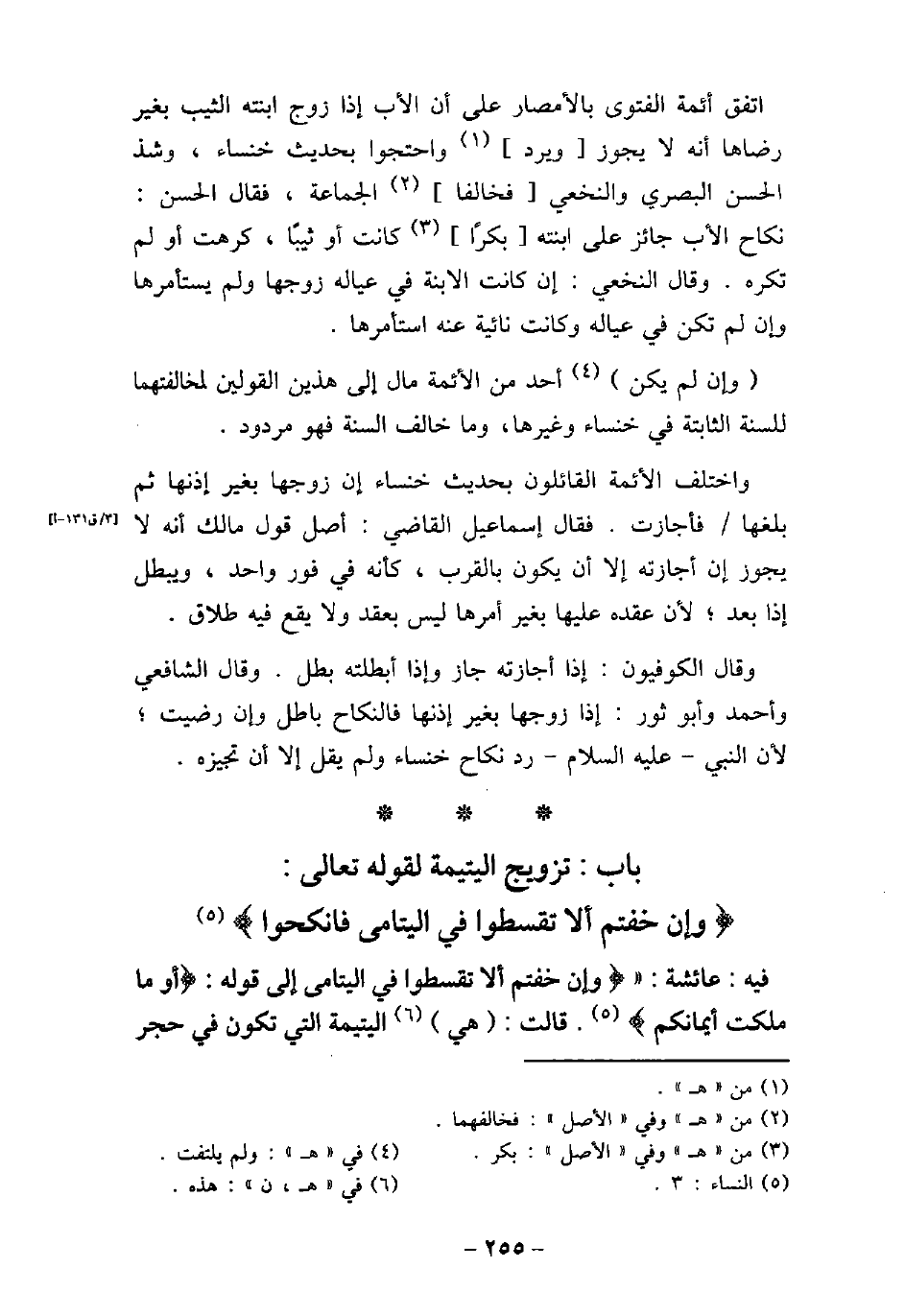 - باب تَزْوِيجِ الْيَتِيمَةِ لِقَوْلِهِ تَعالَى: (وَإِنْ خِفْتُمْ أَلا تُقْسِطُوا فِى الْيَتَامَى فَانْكِحُوا) [النساء: 3]