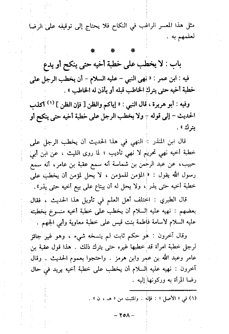 / 37 - فيه: ابْن عُمَر، نَهَى النَّبِىُّ، عَلَيْهِ السَّلام، أَنْ يَخْطُبَ الرَّجُلُ عَلَى خِطْبَةِ أَخِيهِ حَتَّى يَتْرُكَ الْخَاطِبُ قَبْلَهُ، أَوْ يَأْذَنَ لَهُ الْخَاطِبُ. / 38 - وفيه: أَبُو هُرَيْرَةَ، قَالَ النَّبِىّ (صلى الله عليه وسلم) : (إِيَّاكُمْ وَالظَّنَّ، فَإِنَّ الظَّنَّ أَكْذَبُ الْحَدِيثِ) ، إلى قوله: (وَلا يَخْطُبُ الرَّجُلُ عَلَى خِطْبَةِ أَخِيهِ حَتَّى يَنْكِحَ أَوْ يَتْرُكَ) . قال ابن المنذر: النهى فى هذا الحديث أن يخطب الرجل على خطبة أخيه نهى تحريم لا نهى تأديب، لما روى الليث، عن ابن أبى حبيب، عن عبد الرحمن بن شماسة، أنه سمع عقبة بن عامر، أنه سمع رسول الله (صلى الله عليه وسلم) يقول: (المؤمن للمؤمن، لا يحل لمؤمن أن يخطب على خطبة أخيه حتى يذر، ولا يحل له أن يبتاع على بيع أخيه حتى يذر) . قال الطبرى: اختلف أهل العلم فى تأويل هذا الحديث، فقال بعضهم: نهيه عليه السلام أن يخطب على خطبة أخيه منسوخ بخطبته، عليه السلام، لأسامة فاطمة بنت قيس على خطبة معاوية وأبى الجهم. وقال آخرون: هو حكم ثابت لم ينسخه شىء، وهو غير جائز لرجل خطبة امرأة قد خطبها غيره حتى يترك ذلك، هذا قول عقبة بن عامر، وعبد الله بن عمر، وابن هرمز. واحتجوا بعموم الحديث. وقال آخرون: نهيه عليه السلام أن يخطب على خطبة أخيه يريد فى حال رضا المرأة به وركونها إليه.