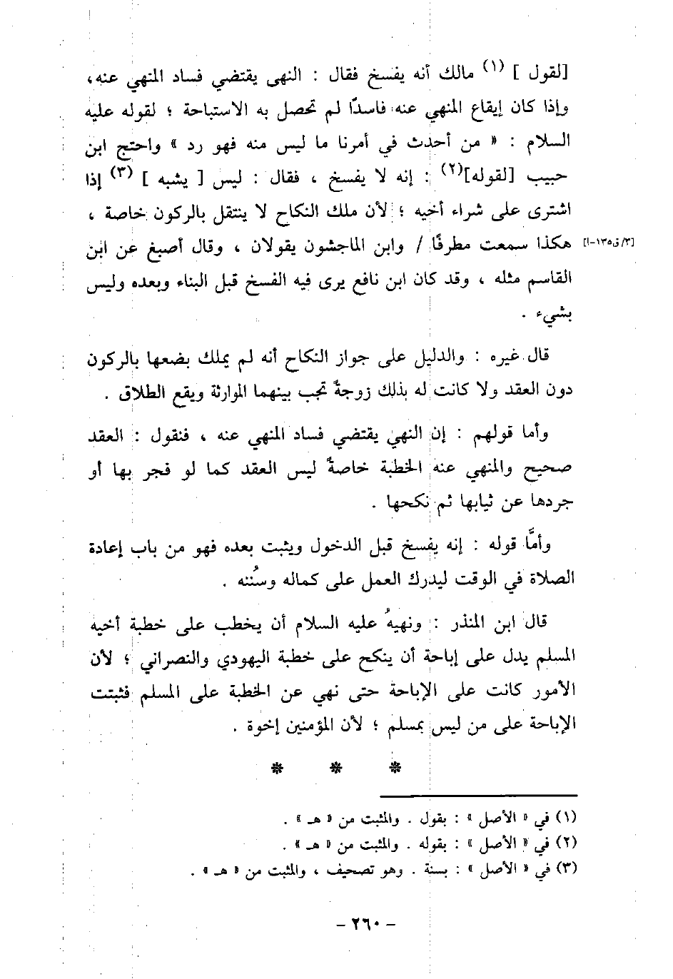لقول مالك أنه يفسخ، فقال: النهى يقتضى فساد المنهى عنه، وإذا كان إيقاع المنهى عنه فاسدًا لم تحصل به الاستباحة؛ لقوله عليه السلام: (من أحدث فى أمرنا ما ليس منه فهو رد) ، واحتج ابن حبيب لقوله: إنه لا يفسخ، فقال: ليس يشبه إذا اشترى على شراء أخيه؛ لأن ملك النكاح لا ينتقل بالركون خاصة، هكذا سمعت مطرفًا، وابن الماجشون يقولان: وقال أصبغ، عن ابن القاسم مثله، وقد كان ابن نافع يرى فيه الفسخ قبل البناء وبعده وليس بشىء. قال غيره: والدليل على جواز النكاح أنه لم يملك بضعها بالركون دون العقد، ولا كانت له بذلك زوجة تجب بينهما الموارثة ويقع الطلاق. وأما قولهم: إن النهى يقتضى فساد المنهى عنه، فنقول: العقد صحيح والمنهى عنه الخطبة خاصة ليس العقد كما لو فجر بها أو جردها عن ثيابها ثم نكحها. وأما قوله: إنه يفسخ قبل الدخول ويثبت بعده، فهو من باب إعادة الصلاة فى الوقت ليدرك العمل على كماله وسننه. قال ابن المنذر: ونهيه عليه السلام أن يخطب على خطبة أخيه المسلم يدل على إباحة أن ينكح على خطبة اليهودى والنصرانى؛ لأن الأمور كانت على الإباحة حتى نهى عن الخطبة على المسلم، فثبتت الإباحة على من ليس بمسلم؛ لأن المؤمنين إخوة.
