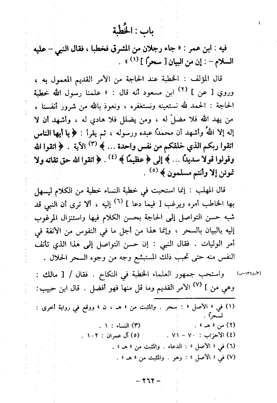 / 40 - فيه: ابْن عُمَرَ، جَاءَ رَجُلانِ مِنَ الْمَشْرِقِ فَخَطَبَا، فَقَالَ النَّبِىُّ عَلَيْهِ السَّلام: (إِنَّ مِنَ الْبَيَانِ سِحْرًا) . قال المؤلف: الخطبة عند الحاجة من الأمر القديم المعمول به، وروى عن ابن مسعود أنه قال: علمنا رسول الله (صلى الله عليه وسلم) خطبة الحاجة: الحمد لله نستعينه ونستغفره، ونعوذ بالله من شرور أنفسنا، من يهد الله فلا مضل له، ومن يضلل فلا هادى له، وأشهد أن لا إله إلا الله، وأشهد أن محمدًا عبده ورسوله، ثم يقرأ: (يا أيها الناس اتقوا ربكم الذى خلقكم من نفس واحدة. . .) [النساء: 1] الآية،) اتقوا الله وقولوا قولاً سديدًا. . . (إلى) عظيمًا) [الأحزاب: 70، 71] ،) اتقوا الله حق تقاته ولا تموتن إلا وأنتم مسلمون) [آل عمران: 102] . قال المهلب: إنما استحبت فى خطبة النساء خطبة من الكلام ليسهل بها الخاطب أمره ويرغب فيما دعا إليه، ألا ترى أن النبى (صلى الله عليه وسلم) قد شبه حسن التواصل إلى الحاجة بحسن الكلام فيها، واستنزال المرغوب إليه بالبيان بالسحر، وإنما هذا من أجل ما فى النفوس من الأنفة فى أمر الوليات، فقال النبى (صلى الله عليه وسلم) : إن حسن التواصل إلى هذا الذى تألف النفس منه حتى تحبب ذلك المستبشع وجه من وجوه السحر الحلال. واستحب جمهور العلماء الخطبة فى النكاح، فقال مالك: وهى من الأمر القديم وما قل منها فهو أفضل. قال ابن حبيب: