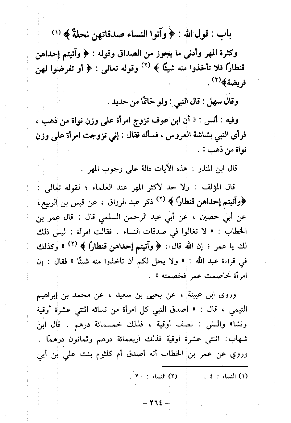 - باب قَوْلِ اللَّهِ: (وَآتُوا النِّسَاءَ صَدُقَاتِهِنَّ نِحْلَةً) [النساء: 4] وَكَثْرَةِ الْمَهْرِ وَأَدْنَى مَا يَجُوزُ مِنَ الصَّدَاقِ، وَقَوْلِهِ: (وَآتَيْتُمْ إِحْدَاهُنَّ قِنْطَارًا فَلا تَأْخُذُوا مِنْهُ شَيْئًا) [النساء: 20] وَقَوْلِهِ تعَالَى: (أَوْ تَفْرِضُوا لَهُنَّ فَرِيضَةً) [النساء: 20]