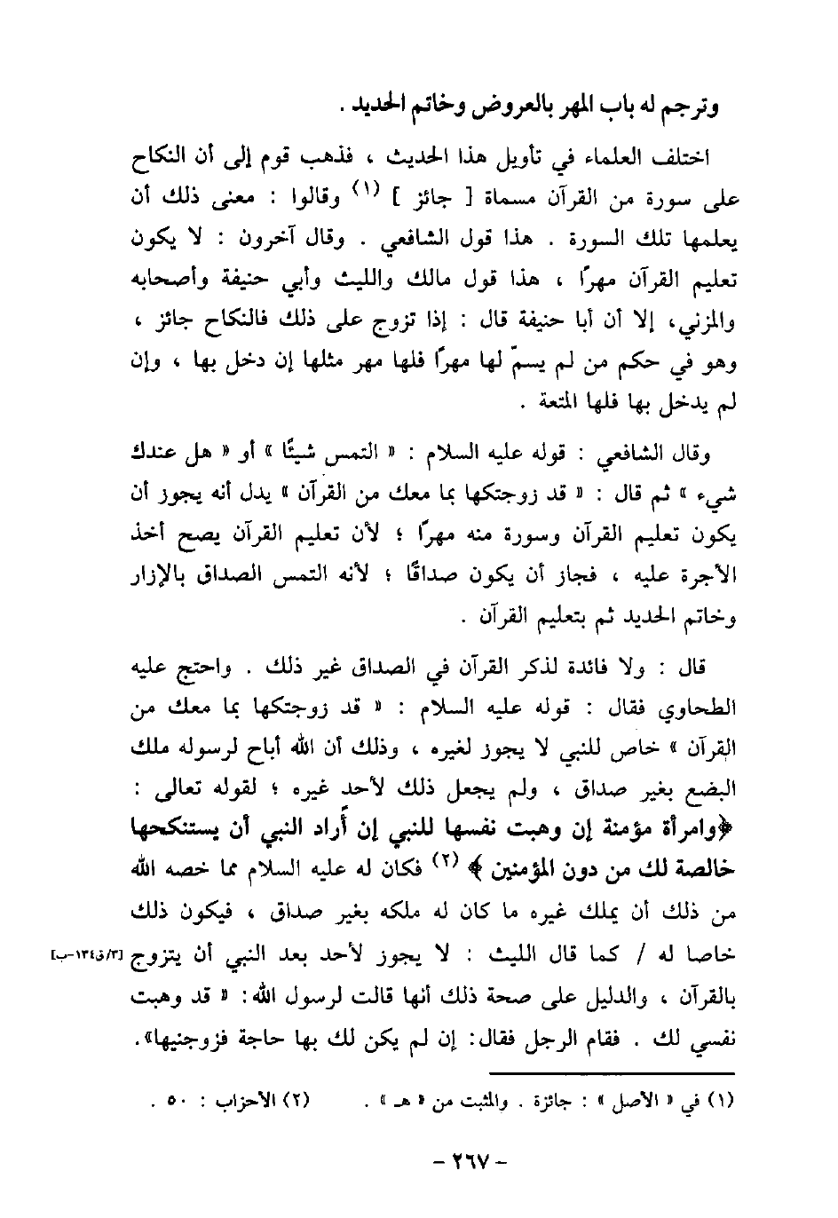 وترجم له: (باب الْمَهْرِ بِالْعُرُوضِ وَخَاتَمٍ مِنْ حَدِيدٍ) . اختلف العلماء فى تأويل هذا الحديث، فذهب قوم إلى أن النكاح على سورة من القرآن مسماة جائز، وقالوا: معنى ذلك أن يعلمها تلك السورة، هذا قول الشافعى. وقال آخرون: لا يكون تعليم القرآن مهرًا، هذا قول مالك، والليث، وأبى حنيفة، وأصحابه، والمزنى، إلا أن أبا حنيفة، قال: إذا تزوج على ذلك فالنكاح جائز، وهو فى حكم من لم يسم لها مهرًا، فلها مهر مثلها إن دخل بها، وإن لم يدخل بها فلها المتعة. وقال الشافعى: قوله عليه السلام: (التمس شيئًا) ، أو: (هل عندك شىء) ، ثم قال: (قد زوجتكها بما معك من القرآن) ، يدل أنه يجوز أن يكون تعليم القرآن وسورة منه مهرًا؛ لأن تعليم القرآن يصح أخذ الأجرة عليه، فجاز أن يكون صداقًا؛ لأنه التمس الصداق بالإزار وخاتم الحديد ثم بتعليم القرآن. قال: ولا فائدة لذكر القرآن فى الصداق غير ذلك، واحتج عليه الطحاوى، فقال: قوله عليه السلام: (قد زوجتكها بما معك من القرآن) ، خاص للنبى (صلى الله عليه وسلم) لا يجوز لغيره، وذلك أن الله أباح لرسوله (صلى الله عليه وسلم) ملك البضع بغير صداق، ولم يجعل ذلك لأحد غيره؛ لقوله تعالى: (وامرأة مؤمنة إن وهبت نفسها للنبى إن أراد النبى أن يستنكحها خالصة لك من دون المؤمنين) [الأحزاب: 50] ، فكان له عليه السلام مما خصه الله من ذلك أن يملك غيره ما كان له ملكه بغير صداق، فيكون ذلك خاصًا له كما قال الليث: لا يجوز لأحد بعد النبى (صلى الله عليه وسلم) أن يتزوج بالقرآن، والدليل على صحة ذلك أنها قالت لرسول الله (صلى الله عليه وسلم) : قد وهبت نفسى لك، فقام الرجل، فقال: إن لم يكن لك بها حاجة فزوجنيها،