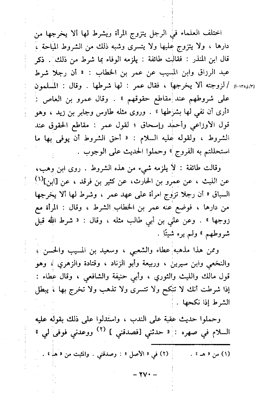 اختلف العلماء فى الرجل يتزوج المرأة ويشرط لها ألا يخرجها من دارها، ولا يتزوج عليها ولا يتسرى وشبه ذلك من الشروط المباحة. قال ابن المنذر: فقالت طائفة: يلزمه الوفاء بما شرط من ذلك. ذكر عبد الرزاق، وابن المسيب، عن عمر بن الخطاب، أن رجلاً شرط لزوجته ألا يخرجها، فقال عمر: لها شرطها. وقال: المسلمون على شروطهم عند مقاطع حقوقهم. وقال عمرو بن العاص: أرى أن تفى لها بشرطها. وروى مثله طاوس، وجابر بن زيد، وهو قول الأوزاعى، وأحمد، وإسحاق؛ لقول عمر: مقاطع الحقوق عند الشروط، ولقوله عليه السلام: (أحق الشروط أن يوفى بها ما استحللتم به الفروج) ، وحملوا الحديث على الوجوب. وقالت طائفة: لا يلزمه شىء من هذه الشروط. روى ابن وهب، عن الليث، عن عمرو ابن الحارث، عن كثير بن فرقد، عن ابن السباق، أن رجلاً تزوج امرأة على عهد عمر، وشرط لها ألا يخرجها من دارها، فوضع عنه عمر بن الخطاب الشرط، وقال: المرأة مع زوجها. وعن على بن أبى طالب مثله، وقال: شرط الله قبل شروطهم، ولم يره شيئًا. وممن هذا مذهبه عطاء، والشعبى، وسعيد بن المسيب، والحسن، والنخعى، وابن سيرين، وربيعة، وأبو الزناد، وقتادة، والزهرى، وهو قول مالك، والليث، والثورى، وأبى حنيفة، والشافعى، وقال عطاء: إذا شرطت أنك لا تنكح ولا تتسرى ولا تذهب ولا تخرج بها، يبطل الشرط إذا نكحها. وحملوا حديث عقبة على الندب، واستدلوا على ذلك بقوله عليه السلام فى صهره: (حدثنى فصدقنى، ووعدنى فوفى لى) ،