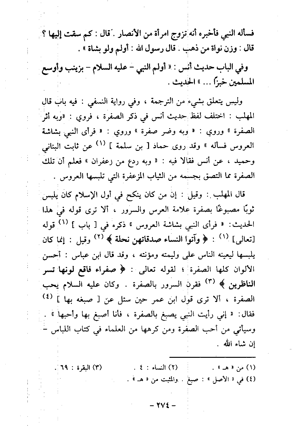 فَسَأَلَهُ النَّبِىّ (صلى الله عليه وسلم) ، فَأَخْبَرَهُ أَنَّهُ تَزَوَّجَ امْرَأَةً مِنَ الأنْصَارِ، قَالَ: (كَمْ سُقْتَ إِلَيْهَا؟) ، قَالَ: وَزْن نَوَاةٍ مِنْ ذَهَبٍ، قَالَ رَسُولُ اللَّهِ (صلى الله عليه وسلم) : (أَوْلِمْ وَلَوْ بِشَاةٍ) . وفى الباب حديث أنس: أولم النبى، عليه السلام، بزينب وأوسع المسلمين خبزًا. . . الحديث. وليس يتعلق بشىء من الترجمة، وفى رواية النسفى: فيه باب قال المهلب: اختلف لفظ حديث أنس فى ذكر الصفرة، فروى: وبه أثر الصفرة. وروى: وبه وضر صفرة. وروى: فرأى النبى (صلى الله عليه وسلم) بشاشة العروس فسأله. وقد روى حماد بن سلمة، عن ثابت البنانى وحميد، عن أنس، فقالا فيه: وبه ردع من زعفران، فعلم أن تلك الصفرة مما التصق بجسمه من الثياب المزعفرة التى تلبسها العروس. قال المهلب: وقيل: إن من كان ينكح فى أول الإسلام كان يلبس ثوبًا مصبوغًا بصفرة علامة العرس والسرور، ألا ترى قوله فى هذا الحديث: فرأى النبى (صلى الله عليه وسلم) بشاشة العروس، ذكره فى باب قوله تعالى: (وآتوا النساء صدقاتهن نحلة) [النساء: 4] ، وقيل: إنما كان يلبسها ليعينه الناس على وليمته ومؤنته، وقد قال ابن عباس: أحسن الألوان كلها الصفرة؛ لقوله تعالى: (صفراء فاقع لونها تسر الناظرين) [البقرة: 69] ، فقرن السرور بالصفرة، وكان عليه السلام يحب الصفرة، ألا ترى قول ابن عمر حين سئل عن صبغه بها، فقال: إنى رأيت النبى (صلى الله عليه وسلم) يصبغ بالصفرة، فأنا أصبغ بها وأحبها، وسيأتى من أحب الصفرة ومن كرهها من العلماء فى كتاب اللباس، إن شاء الله.