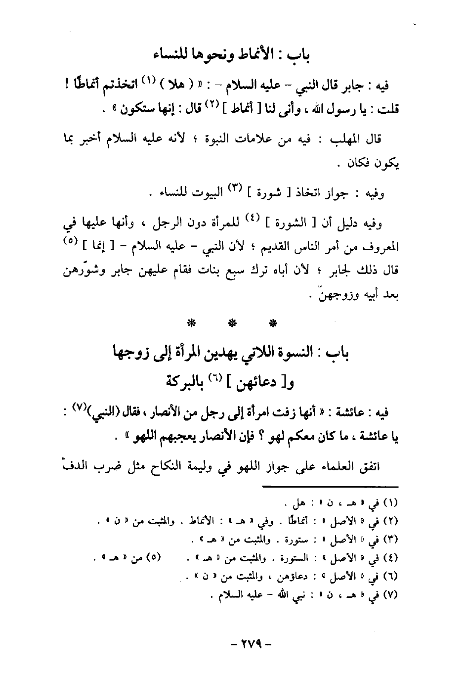 / 53 - فيه: عَائِشَةَ، أَنَّهَا زَفَّتِ امْرَأَةً إِلَى رَجُلٍ مِنَ الأنْصَارِ، فَقَالَ النِّبِىُ (صلى الله عليه وسلم) : (يَا عَائِشَةُ، مَا كَانَ مَعَكُمْ لَهْوٌ؟ فَإِنَّ الأنْصَارَ يُعْجِبُهُمُ اللَّهْوُ) . اتفق العلماء على جواز اللهو فى وليمة النكاح، مثل ضرب الدف