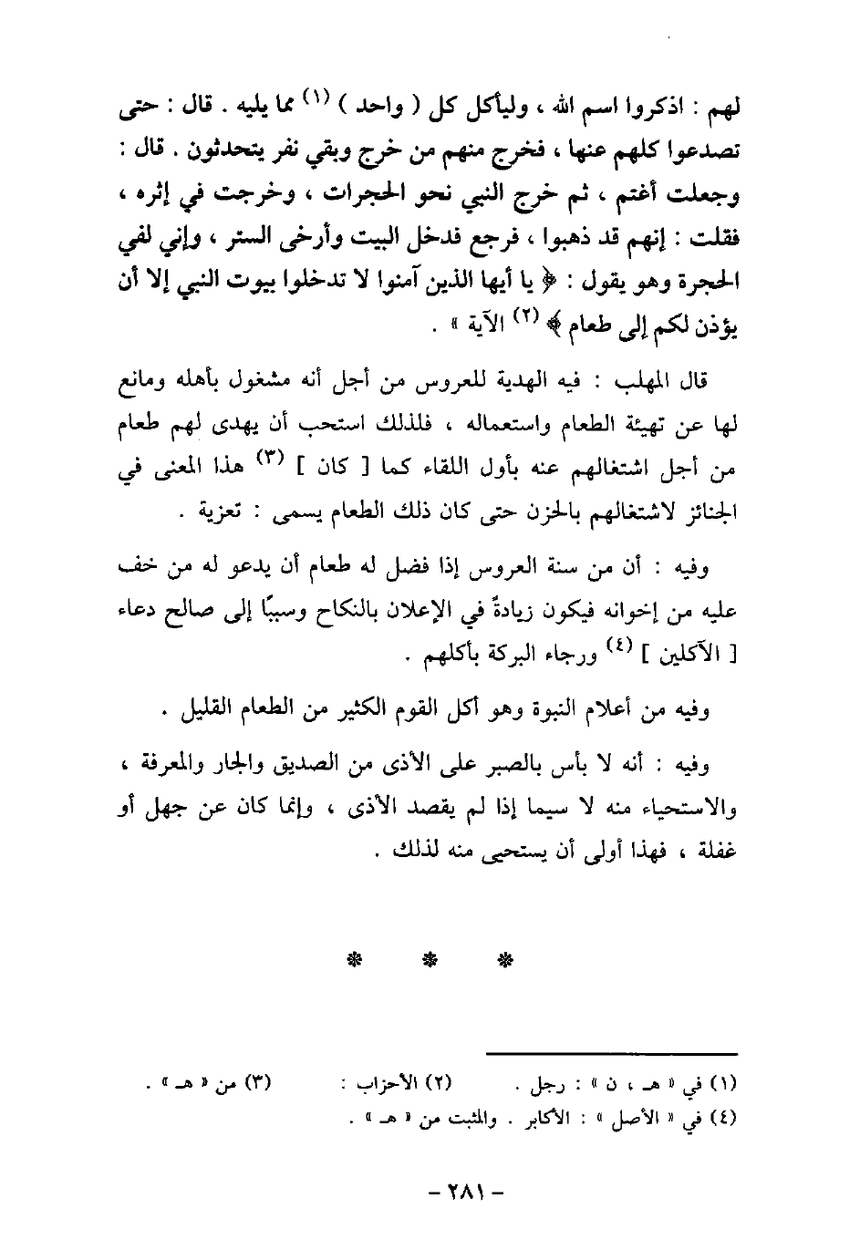لَهُمُ: (اذْكُرُوا اسْمَ اللَّهِ، وَلْيَأْكُلْ كُلُّ وَاحِدٍ مِمَّا يَلِيهِ) ، قَالَ: حَتَّى تَصَدَّعُوا كُلُّهُمْ عَنْهَا، فَخَرَجَ مِنْهُمْ مَنْ خَرَجَ، وَبَقِىَ نَفَرٌ يَتَحَدَّثُونَ، قَالَ: وَجَعَلْتُ أَغْتَمُّ، ثُمَّ خَرَجَ النَّبِىُّ (صلى الله عليه وسلم) نَحْوَ الْحُجُرَاتِ، وَخَرَجْتُ فِى إِثْرِهِ، فَقُلْتُ: إِنَّهُمْ قَدْ ذَهَبُوا، فَرَجَعَ فَدَخَلَ الْبَيْتَ، وَأَرْخَى السِّتْرَ، وَإِنِّى لَفِى الْحُجْرَةِ، وَهُوَ يَقُولُ: (يَا أَيُّهَا الَّذِينَ آمَنُوا لا تَدْخُلُوا بُيُوتَ النَّبِىِّ إِلا أَنْ يُؤْذَنَ لَكُمْ إِلَى طَعَامٍ) [الأحزاب: 53] الآية. قال المهلب: فيه الهدية للعروس من أجل أنه مشغول بأهله ومانع لها عن تهيئة الطعام واستعماله، فلذلك استحب أن يهدى لهم طعام من أجل اشتغالهم عنه بأول اللقاء كما كان هذا المعنى فى الجنائز لاشتغالهم بالحزن حتى كان ذلك الطعام يسمى تعزية. وفيه: أن من سنة العروس إذا فضل له طعام أن يدعو له من خف عليه من إخوانه، فيكون زيادة فى الإعلان بالنكاح وسببًا إلى صالح دعاء الآكلين ورجاء البركة بأكلهم. وفيه: من أعلام النبوة، وهو أكل القوم الكثير من الطعام القليل. وفيه: أنه لا بأس بالصبر على الأذى من الصديق والجار والمعرفة، والاستحياء منه لاسيما إذا لم يقصد الأذى، وإنما كان عن جهل أو غفلة، فهذا أولى أن يستحيى منه لذلك.