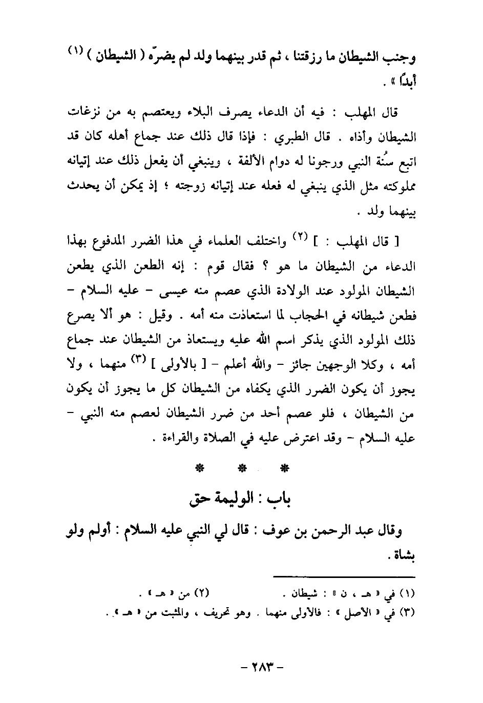 وَجَنِّبِ الشَّيْطَانَ مَا رَزَقْتَنَا، ثُمَّ قُدِّرَ بَيْنَهُمَا فِى ذَلِكَ، أَوْ قُضِىَ وَلَدٌ، لَمْ يَضُرَّهُ شَيْطَانٌ أَبَدًا) . قال المهلب: فيه أن الدعاء يصرف البلاء ويعتصم به من نزعات الشيطان وأذاه. قال الطبرى: فإذا قال ذلك عند جماع أهله كان قد اتبع سنة النبى (صلى الله عليه وسلم) ، ورجونا له دوام الألفة، وينبغى أن يفعل ذلك عند إتيانه مملوكته مثل الذى ينبغى أن يفعله عند إتيانه زوجته، إذ يمكن أن يحدث بينهما ولد. قال المهلب: واختلف العلماء فى هذا الضرر المدفوع بهذا الدعاء من الشيطان ما هو؟ فقال قوم: إنه الطعن الذى يطعن الشيطان المولود عند الولادة الذى عصم منه عيسى، عليه السلام، فطعن شيطانه فى الحجاب لما استعاذت منه أمه. وقيل: هو ألا يصرع ذلك المولود الذى يذكر اسم الله عليه ويستعاذ من الشيطان عند جماع أمه، وكلا الوجهين جائز، والله أعلم بالأولى منهما، ولا يجوز أن يكون الضرر الذى يكفاه من الشيطان كل ما يجوز أن يكون من الشيطان، فلو عصم أحد من ضرر الشيطان لعصم منه النبى، عليه السلام، وقد اعترض عليه فى الصلاة والقراءة.