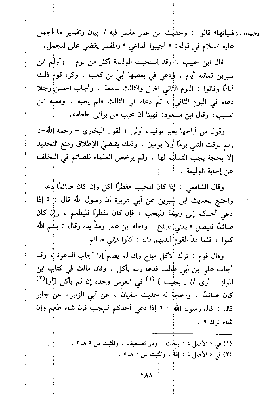 فليأتها) ، قالوا: وحديث ابن عمر مفسر فيه بيان وتفسير ما أجمل، عليه السلام، فى قوله: (أجيبوا الداعى) ، والمفسر يقضى على المجمل. قال ابن حبيب: وقد استحبت الوليمة أكثر من يوم، وأولم ابن سيرين ثمانية أيام، ودعى فى بعضها أبى بن كعب، وكره قوم ذلك أيامًا، وقالوا: اليوم الثانى فضل، والثالث سمعة. وأجاب الحسن رجلاً دعاه فى اليوم الثانى، ثم دعاه فى الثالث فلم يجبه، وفعله ابن المسيب، وقال ابن مسعود: نهينا أن نجيب من يرائى بطعامه. وقول من أباحها بغير توقيت أولى؛ لقول البخارى، رحمه الله: ولم يوقت النبى (صلى الله عليه وسلم) يومًا ولا يومين، وذلك يقتضى الإطلاق ومنع التحديد إلا بحجة يجب التسليم لها، ولم يرخص العلماء للصائم فى التخلف عن إجابة الوليمة. وقال الشافعى: إذا كان المجيب مفطرًا أكل وإن كان صائمًا دعا. واحتج بحديث ابن سيرين، عن أبى هريرة، أن رسول الله (صلى الله عليه وسلم) قال: (إذا دعى أحدكم إلى وليمة فليجب، فإن كان مفطرًا فليطعم، وإن كان صائمًا فليصل) ، يعنى فليدع. وفعله ابن عمر ومد يده، وقال: بسم الله كلوا، فلما مد القوم أيديهم، قال: كلوا فإنى صائم. وقال قوم: ترك الأكل مباح وإن لم يصم إذا أجاب الدعوة، وقد أجاب على بن أبى طالب فدعا ولم يأكل. وقال مالك فى كتاب ابن المواز: أرى أن يجيب فى العرس وحده إن لم يأكل أو كان صائمًا. والحجة له حديث سفيان، عن أبى الزبير، عن جابر، قال: قال رسول الله (صلى الله عليه وسلم) : (إذا دعى أحدكم فليجب، فإن شاء طعم وإن شاء ترك) .
