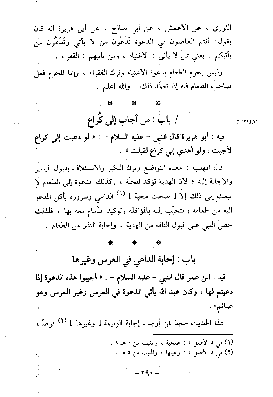 الثورى، عن الأعمش، عن أبى صالح، عن أبى هريرة، أنه كان يقول: أنتم العاصون فى الدعوة تدعون من لا يأتى وتدعون من يأتيكم، يعنى بمن لا يأتى الأغنياء، ومن يأتيهم الفقراء. وليس يحرم الطعام بدعوة الأغنياء وترك الفقراء، وإنما المحرم فعل صاحب الطعام فيه إذا تعمد ذلك، والله أعلم.