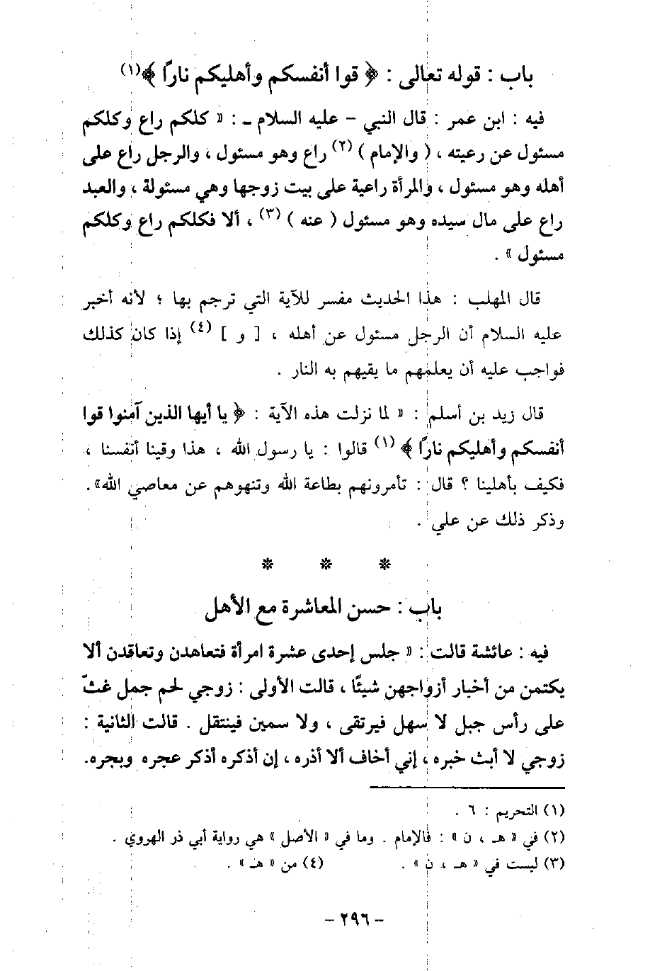 / 77 - فيه: ابْن عُمَرَ، قَالَ النَّبِىُّ، عَلَيْهِ السَّلام: (كُلُّكُمْ رَاعٍ وَكُلُّكُمْ مَسْئُولٌ عن رعيته، وَالإمَامُ رَاعٍ وَهُوَ مَسْئُولٌ، وَالرَّجُلُ رَاعٍ عَلَى أَهْلِهِ وَهُوَ مَسْئُولٌ، وَالْمَرْأَةُ رَاعِيَةٌ عَلَى بَيْتِ زَوْجِهَا وَهِىَ مَسْئُولَةٌ، وَالْعَبْدُ رَاعٍ عَلَى مَالِ سَيِّدِهِ وَهُوَ مَسْئُولٌ عنه، أَلا فَكُلُّكُمْ رَاعٍ وَكُلُّكُمْ مَسْئُولٌ) . قال المهلب: هذا الحديث مفسر للآية التى ترجم بها؛ لأنه أخبر عليه السلام أن الرجل مسئول عن أهله، وإذا كان كذلك فواجب عليه أن يعلمهم ما يقيهم به النار. قال زيد بن أسلم: لما نزلت هذه الآية: (يا أيها الذين آمنوا قوا أنفسكم وأهليكم نارًا) [التحريم: 6] ، قالوا: يا رسول الله، هذا وقينا أنفسنا، فكيف بأهلينا؟ قال: (تأمرونهم بطاعة الله وتنهوهم عن معاصى الله) ، وذكر ذلك عن على.