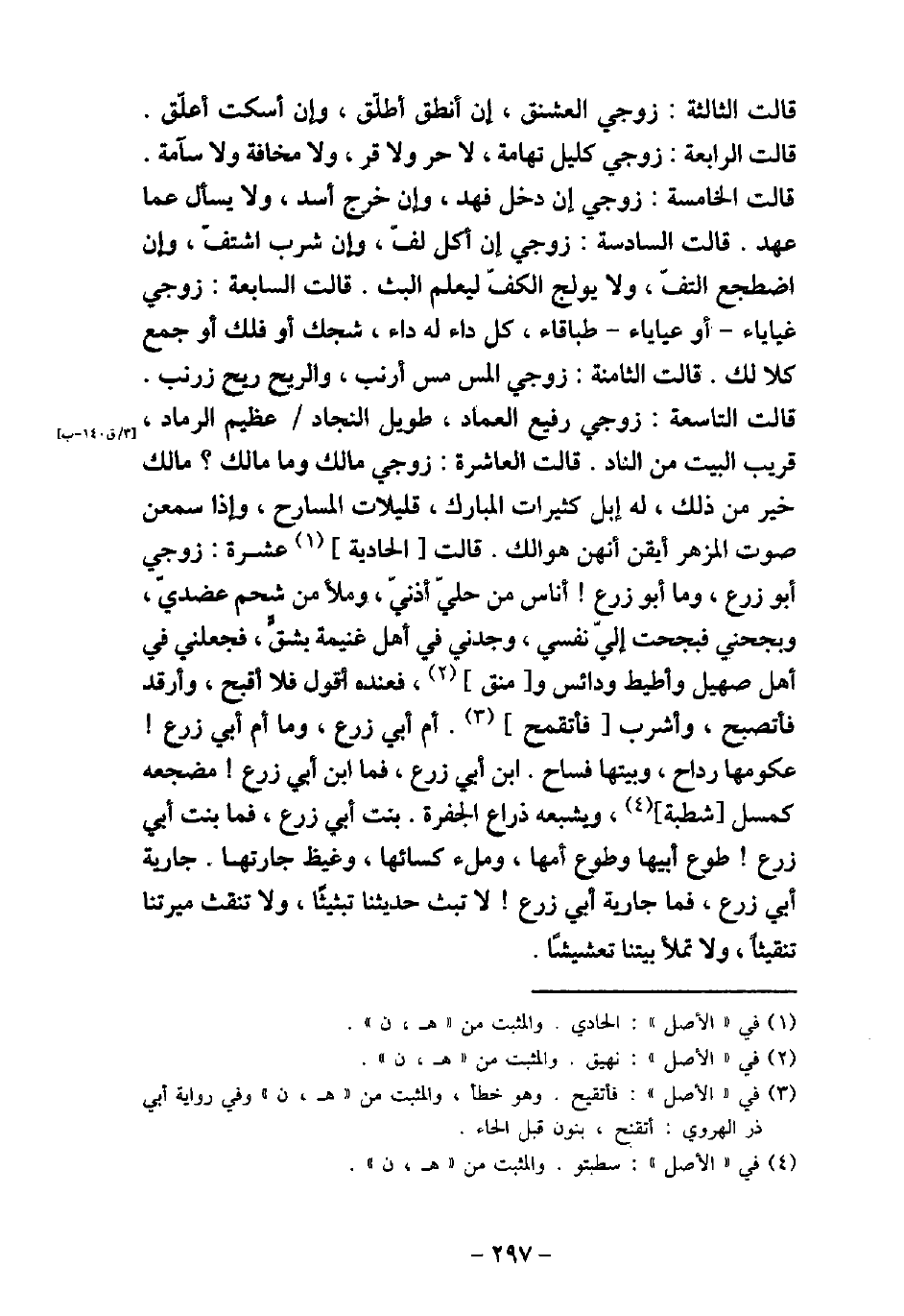 قَالَتِ الثَّالِثَةُ: زَوْجِى الْعَشَنَّقُ، إِنْ أَنْطِقْ أُطَلَّقْ، وَإِنْ أَسْكُتْ أُعَلَّقْ، قَالَتِ الرَّابِعَةُ: زَوْجِى كَلَيْلِ تِهَامَةَ، لا حَرٌّ، وَلا قُرٌّ، وَلا مَخَافَةَ، وَلا سَآمَةَ، قَالَتِ الْخَامِسَةُ: زَوْجِى إِنْ دَخَلَ فَهِدَ، وَإِنْ خَرَجَ أَسِدَ، وَلا يَسْأَلُ عَمَّا عَهِدَ، قَالَتِ السَّادِسَةُ: زَوْجِى إِنْ أَكَلَ لَفَّ، وَإِنْ شَرِبَ اشْتَفَّ، وَإِنِ اضْطَجَعَ الْتَفَّ، وَلا يُولِجُ الْكَفَّ؛ لِيَعْلَمَ الْبَثَّ، قَالَتِ السَّابِعَةُ: زَوْجِى غَيَايَاءُ - أَوْ عَيَايَاءُ - طَبَاقَاءُ، كُلُّ دَاءٍ لَهُ دَاءٌ، شَجَّكِ أَوْ فَلَّكِ، أَوْ جَمَعَ كُلا لَكِ، قَالَتِ الثَّامِنَةُ: زَوْجِى الْمَسُّ مَسُّ أَرْنَبٍ، وَالرِّيحُ رِيحُ زَرْنَبٍ، قَالَتِ التَّاسِعَةُ: زَوْجِى رَفِيعُ الْعِمَادِ، طَوِيلُ النِّجَادِ، عَظِيمُ الرَّمَادِ، قَرِيبُ الْبَيْتِ مِنَ النَّادِ. قَالَتِ الْعَاشِرَةُ: زَوْجِى مَالِكٌ، وَمَا مَالِكٌ؟ مَالِكٌ خَيْرٌ مِنْ ذَلِكِ، لَهُ إِبِلٌ كَثِيرَاتُ الْمَبَارِكِ، قَلِيلاتُ الْمَسَارِحِ، وَإِذَا سَمِعْنَ صَوْتَ الْمِزْهَرِ، أَيْقَنَّ أَنَّهُنَّ هَوَالِكُ، قَالَتِ الْحَادِيَةَ عَشْرَةَ: زَوْجِى أَبُو زَرْعٍ، وَمَا أَبُو زَرْعٍ؟ أَنَاسَ مِنْ حُلِىٍّ أُذُنَىَّ، وَمَلأ مِنْ شَحْمٍ عَضُدَىَّ، وَبَجَّحَنِى فَبَجِحَتْ إِلَىَّ نَفْسِى، وَجَدَنِى فِى أَهْلِ غُنَيْمَةٍ بِشِقٍّ، فَجَعَلَنِى فِى أَهْلِ صَهِيلٍ وَأَطِيطٍ، وَدَائِسٍ وَمُنَقٍّ، فَعِنْدَهُ أَقُولُ فَلا أُقَبَّحُ، وَأَرْقُدُ فَأَتَصَبَّحُ، وَأَشْرَبُ فَأَتَقَمَّحُ، أُمُّ أَبِى زَرْعٍ، فَمَا أُمُّ أَبِى زَرْعٍ؟ عُكُومُهَا رَدَاحٌ، وَبَيْتُهَا فَسَاحٌ، ابْنُ أَبِى زَرْعٍ، فَمَا ابْنُ أَبِى زَرْعٍ؟ مَضْجَعُهُ كَمَسَلِّ شَطْبَةٍ، وَيُشْبِعُهُ ذِرَاعُ الْجَفْرَةِ، بِنْتُ أَبِى زَرْعٍ، فَمَا بِنْتُ أَبِى زَرْعٍ؟ طَوْعُ أَبِيهَا، وَطَوْعُ أُمِّهَا، وَمِلْءُ كِسَائِهَا، وَغَيْظُ جَارَتِهَا، جَارِيَةُ أَبِى زَرْعٍ، فَمَا جَارِيَةُ أَبِى زَرْعٍ؟ لا تَبُثُّ حَدِيثَنَا تَبْثِيثًا، وَلا تُنَقِّثُ مِيرَتَنَا تَنْقِيثًا، وَلا تَمْلأ بَيْتَنَا تَعْشِيشًا.