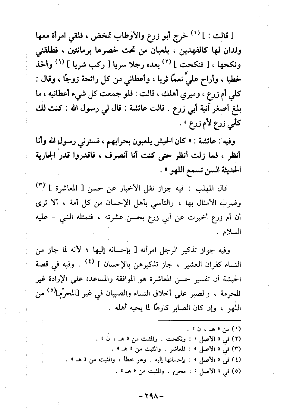 قَالَتْ: خَرَجَ أَبُو زَرْعٍ وَالأوْطَابُ تُمْخَضُ، فَلَقِىَ امْرَأَةً مَعَهَا وَلَدَانِ لَهَا كَالْفَهْدَيْنِ، يَلْعَبَانِ مِنْ تَحْتِ خَصْرِهَا بِرُمَّانَتَيْنِ، فَطَلَّقَنِى وَنَكَحَهَا، فَنَكَحْتُ بَعْدَهُ رَجُلا سَرِيًّا، رَكِبَ شَرِيًّا، وَأَخَذَ خَطِّيًّا، وَأَرَاحَ عَلَىَّ نَعَمًا ثَرِيًّا، وَأَعْطَانِى مِنْ كُلِّ رَائِحَةٍ زَوْجًا، وَقَالَ: كُلِى أُمَّ زَرْعٍ، وَمِيرِى أَهْلَكِ، قَالَتْ: فَلَوْ جَمَعْتُ كُلَّ شَىْءٍ أَعْطَانِيهِ، مَا بَلَغَ أَصْغَرَ آنِيَةِ أَبِى زَرْعٍ، قَالَتْ عَائِشَةُ: قَالَ لى رَسُولُ اللَّهِ (صلى الله عليه وسلم) : (كُنْتُ لَكِ كَأَبِى زَرْعٍ لأمِّ زَرْعٍ) . / 79 - وفيه: عَائِشَةَ، كَانَ الْحَبَشُ يَلْعَبُونَ بِحِرَابِهِمْ، فَسَتَرَنِى رَسُولُ اللَّهِ (صلى الله عليه وسلم) وَأَنَا أَنْظُرُ، فَمَا زِلْتُ أَنْظُرُ حَتَّى كُنْتُ أَنَا أَنْصَرِفُ، فَاقْدُرُوا قَدْرَ الْجَارِيَةِ الْحَدِيثَةِ السِّنِّ، تَسْمَعُ اللَّهْوَ. قال المهلب: فيه جواز نقل الأخبار عن حسن المعاشرة وضرب الأمثال بها، والتأسى بأهل الإحسان من كل أمة، ألا ترى أن أم زرع أخبرت عن أبى زرع بحسن عشرته، فتمثله النبى، عليه السلام. وفيه: جواز تذكير الرجل امرأته بإحسانه إليها؛ لأنه لما جاز من النساء كفران العشير، جاز تذكيرهن بالإحسان، وفيه فى قصة الحبشة أن تفسير حسن المعاشرة هو الموافقة والمساعدة على الإرادة غير المحرمة، والصبر على أخلاق النساء والصبيان فى غير المحرم من اللهو، وإن كان الصابر كارهًا لما يحبه أهله.