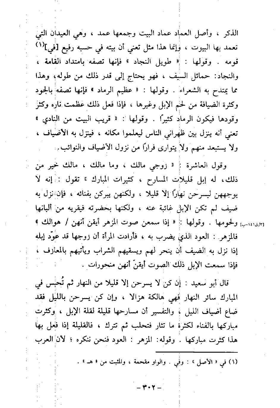 الذكر، وأصل العماد عماد البيت وجمعها عمد، وهى العيدان التى تعمد بها البيوت، وإنما هذا مثل تعنى أن بيته فى حسبه رفيع فى قومه. وقولها: طويل النجاد، فإنها تصفه بامتداد القامة، والنجاد حمائل السيف، فهو يحتاج إلى قدر ذلك من طوله، وهذا مما يمتدح به الشعراء. وقولها: عظيم الرماد، فإنها تصفه بالجود وكثرة الضيافة من لحم الإبل وغيرها، فإذا فعل ذلك عظمت ناره وكثر وقودها، فيكون الرماد كثيرًا. وقولها: قريب البيت من النادى، تعنى أنه ينزل بين ظهرانى الناس ليعلموا مكانه، فينزل به الأضياف، ولا يستبعد منهم ولا يتوارى فرارًا من نزول الأضياف والنوائب. وقول العاشرة: زوجى مالك، وما مالك، مالك خير من ذلك، له إبل قليلات المسارح، كثيرات المبارك، تقول: إنه لا يوجههن ليسرحن نهارًا إلا قليلاً، ولكنهن يبركن بفنائه، فإن نزل به ضيف لم تكن الإبل غائبة عنه، ولكنها بحضرته فيقريه من ألبانها ولحومها. وقولها: إذا سمعن صوت المزهر أيقن أنهن هوالك، فالمزهر العود الذى يضرب به، فأرادت المرأة أن زوجها قد عود إبله إذا نزل به الضيف أن ينحر لهم ويسقيهم الشراب ويأتيهم بالمعازف، فإذا سمعت الإبل ذلك الصوت أيقن أنهن منحورات. قال أبو سعيد: إن كن لا يسرحن إلا قليلاً من النهار ثم تُحبس فى المبارك سائر النهار، فهى هالكة هزالاً، وإن كن يسرحن بالليل فقد ضاع أضياف الليل، والتفسير أن مسارحها قليلة لقلة الإبل، وكثرت مباركها بالفناء لكثرة ما تثار فتحلب ثم تترك، فالقليلة إذا فعل بها هذا كثرت مباركها. وقوله: المزهر العود فنحن ننكره؛ لأن العرب
