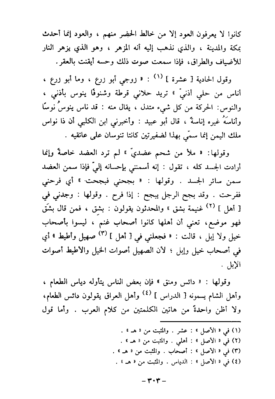 كانوا لا يعرفون العود إلا من خالط الحضر منهم، والعود إنما أحدث بمكة والمدينة، والذى نذهب إليه أنه المزهر، وهو الذى يزهر النار للأضياف والطراق، فإذا سمعت صوت ذلك وحسه أيقنت بالعقر. وقول الحادية عشرة: زوجى أبو زرع، وما أبو زرع، أناس من حلى أذنى، تريد حلانى قرطة وشنوفًا ينوس بأذنى، والنوس الحركة من كل شىء متدل، يقال منه: قد ناس ينوس نوسًا وأناسه غيره إناسة. قال أبو عبيد: وأخبرنى ابن الكلبى أن ذا نواس ملك اليمن إنما سمى بهذا لضفيرتين كانتا تنوسان على عاتقيه. وقولها: ملأ من شحم عضدى، لم ترد العضد خاصة، وإنما أرادت الجسد كله، تقول: إنه أسمننى بإحسانه إلىّ، فإذا سمن العضد سمن سائر الجسد. وقولها: بجحنى فبجحت، أى فرحنى ففرحت. وقد بجح الرجل يبجح، إذا فرح. وقولها: وجدنى فى أهل غنيمة بشق، والمحدثون يقولون: بشق، فمن قال بشق فهو موضع، تعنى أن أهلها كانوا أصحاب غنم، ليسوا بأصحاب خيل ولا إبل، قالت: فجعلنى فى أهل صهيل وأطيط، أى فى أصحاب خيل وإبل؛ لأن الصهيل أصوات الخيل والأطيط أصوات الإبل. وقولها: دائس ومنق، فإن بعض الناس يتأوله دياس الطعام، وأهل الشام يسمونه الدراس، وأهل العراق يقولون: دائس الطعام، ولا أظن واحدة من هاتين الكلمتين من كلام العرب. وأما قول