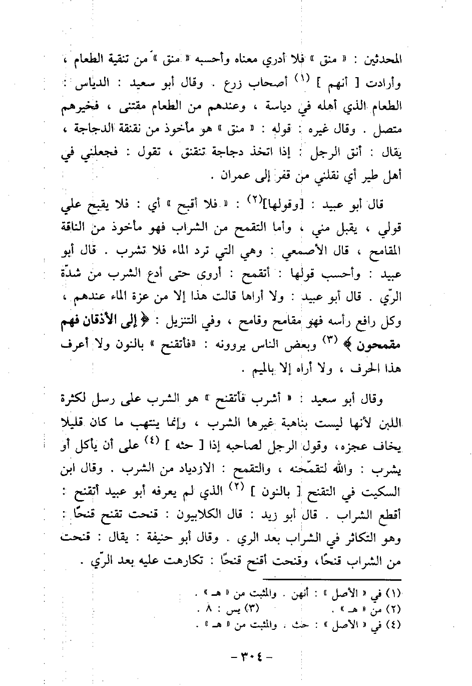 المحدثين: منق، فلا أدرى معناه، وأحسبه منق من تنقية الطعام، وأرادت أنهم أصحاب زرع. وقال أبو سعيد: الدياس الطعام الذى أهله فى دياسة، وعندهم من الطعام مقتنى، فخيرهم متصل. وقال غيره: قوله: منق، هو مأخوذ من نقنقة الدجاجة، يقال: أنق الرجل، إذا اتخذ دجاجة تنقنق، تقول: فجعلنى فى أهل طير، أى نقلنى من قفر إلى عمران. قال أبو عبيد: وقولها: فلا أقبح، أى فلا يقبح على قولى، يقبل منى، وأما التقمح من الشراب فهو مأخوذ من الناقة المقامح. قال الأصمعى: وهى التى ترد الماء فلا تشرب. قال أبو عبيد: وأحسب قولها: أتقمح، أروى حتى أدع الشرب من شدة الرى. قال أبو عبيد: ولا أراها قالت هذا إلا من عزة الماء عندهم، وكل رافع رأسه فهو مقامح وقامح، وفى التنزيل: (إلى الأذقان فهم مقمحون) [يس: 8] ، وبعض الناس يروونه فأتقنح، بالنون ولا أعرف هذا الحرف، ولا أراه إلا بالميم. وقال أبو سعيد: أشرب فأتقنح، هو الشرب على رسل لكثرة اللبن؛ لأنها ليست بناهبة غيرها الشرب، وإنما ينتهب ما كان قليلاً يخاف عجزه، وقول الرجل لصاحبه إذا حثه على أن يأكل أو يشرب: والله لتقمحنه، والتقمح الازدياد من الشرب. وقال ابن السكيت فى التقنح بالنون الذى لم يعرفه أبو عبيد أتقنح: أقطع الشراب. قال أبو زيد: قال الكلابيون: قنحت تقنح قنحًا، وهو التكاثر فى الشراب بعد الرى. وقال أبو حنيفة: يقال: قنحت من الشراب قنحًا، وقنحت أقنح قنحًا، تكارهت عليه بعد الرى،