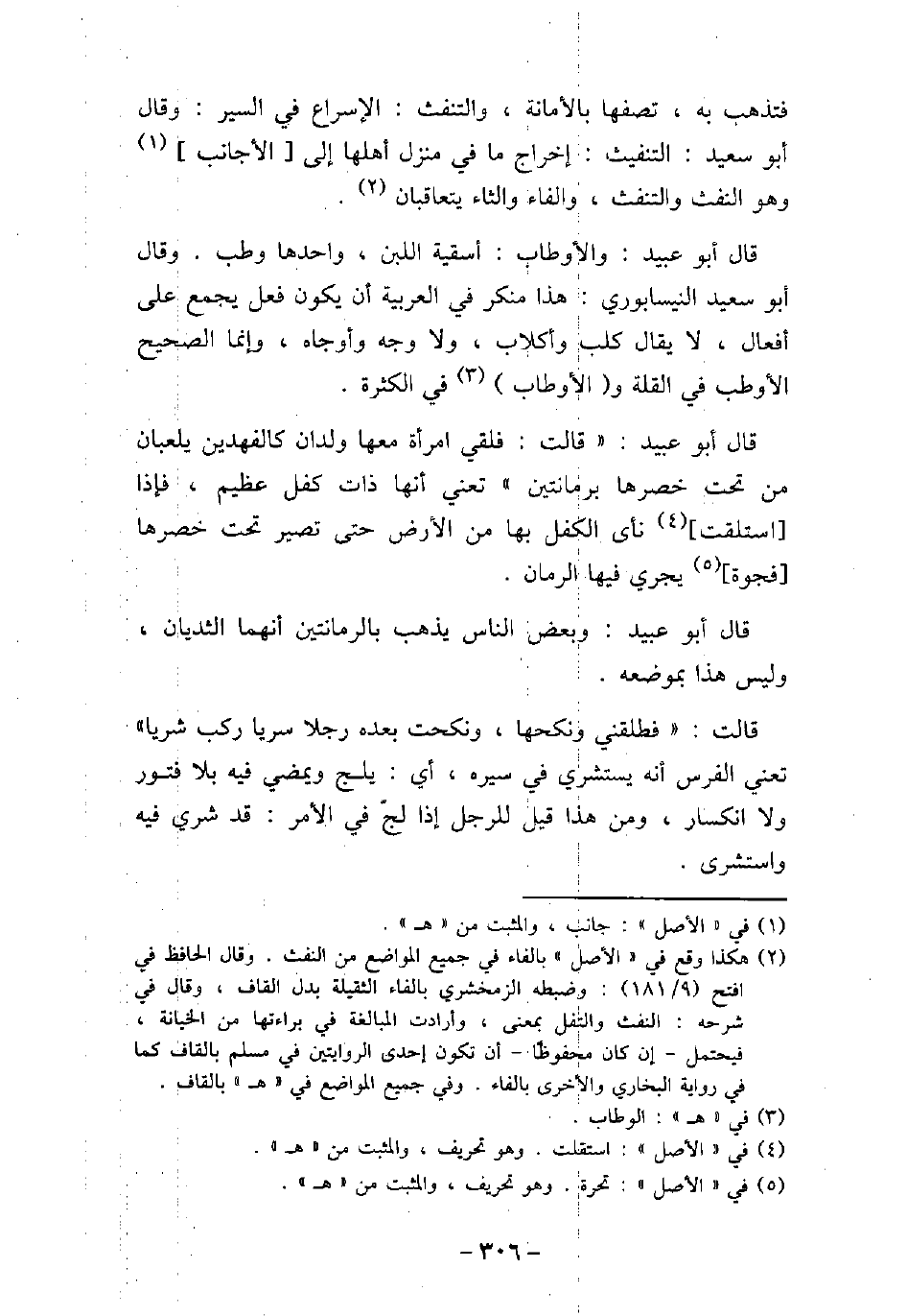 فتذهب به، تصفها بالأمانة، والتنفث الإسراع فى السير. وقال أبو سعيد: التنفيث إخراج ما فى منزل أهلها إلى الأجانب، وهو النفث والتنفث، والفاء والثاء يتعاقبان. قال أبو عبيد: والأوطاب أسقية اللبن، واحدها وطب. وقال أبو سعيد النيسابورى: هذا منكر فى العربية أن يكون فعل يجمع على أفعال، لا يقال: كلب وأكلاب، ولا وجه وأوجاه، وإنما الصحيح الأوطب فى القلة والأوطاب فى الكثرة. قال أبو عبيد: قالت: فلقى امرأة معها ولدان كالفهدين يلعبان من تحت خصرها برمانتين، تعنى أنها ذات كفل عظيم، فإذا استقلت نأى الكفل بها من الأرض حتى تصير تحت خصرها فجوة يجرى فيها الرمان. قال أبو عبيد: وبعض الناس يذهب بالرمانتين أنهما الثديان، وليس هذا بموضعه. قالت: فطلقنى ونكحها، ونكحت بعده رجلاً سريًا ركب شريًا، تعنى الفرس أنه يستشرى فى سيره، أى يلج ويمضى فيه بلا فتور ولا انكسار، ومن هذا قيل للرجل إذا لج فى الأمر: قد شرى فيه واستشرى.