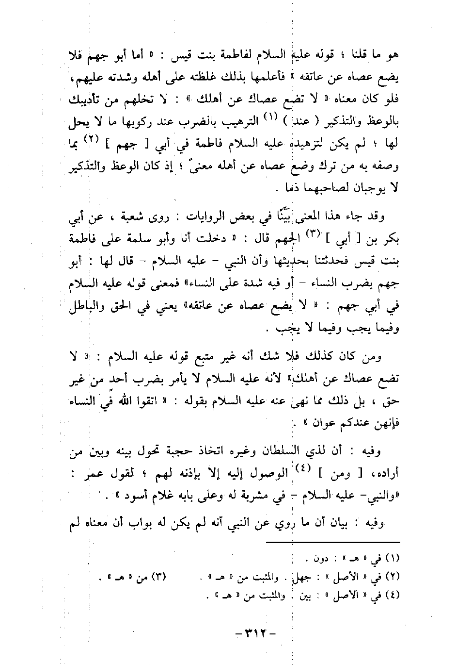 هو ما قلنا، قوله عليه السلام لفاطمة بنت قيس: (أما أبو جهل، فلا يضع عصاه عن عاتقه) ، فأعلمها بذلك غلظته على أهله وشدته عليهم، فلو كان معناه: (لا تضع عصاك عن أهلك) ، لا تخلهم من تأديبك بالوعظ والتذكير عند الترهيب بالضرب عند ركوبها ما لا يحل لها، لم يكن لتزهيده، عليه السلام، فاطمة فى أبى جهم بما وصفه به من ترك وضع عصاه عن أهله معنى، إذ كان الوعظ والتذكير لا يوجبان لصاحبهما ذما. وقد جاء هذا المعنى بينًا فى بعض الروايات: روى شعبة، عن أبى بكر بن أبى الجهم، قال: دخلت أنا وأبو سلمة على فاطمة بنت قيس، فحدثنا بحديثها، وأن النبى، عليه السلام، قال لها: أبو جهم يضرب النساء، أو فيه شدة على النساء، فمعنى قوله عليه السلام فى أبى جهم: (لا يضع عصاه عن عاتقه) ، يعنى فى الحق والباطل وفيما يجب وفيما لا يجب. ومن كان كذلك، فلا شك أنه غير متبع قوله عليه السلام: (لا تضع عصاك عن أهلك) ؛ لأنه عليه السلام لا يأمر بضرب أحد من غير حق، بل ذلك مما نهى عنه، عليه السلام، بقوله: (اتقوا الله فى النساء، فإنهن عندكم عوان) . وفيه: أن لذى السلطان وغيره اتخاذ حجبة تحول بينه وبين من أراده، ومن الوصول إليه إلا بإذنه لهم؛ لقول عمر: والنبى عليه السلام فى مشربة له وعلى بابه غلام أسود. وفيه: بيان أن ما روى عن النبى (صلى الله عليه وسلم) أنه لم يكن له بواب أن معناه لم