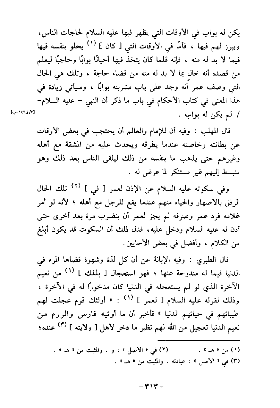 يكن له بواب فى الأوقات التى يظهر فيها، عليه السلام، لحاجات الناس، ويبرز لهم فيها، فأما فى الأوقات التى كان يخلو بنفسه فيها فيما لابد له منه، فإنه قلما كان يتخذ فيها أحيانًا بوابًا وحاجبًا ليعلم من قصده أنه خال بما لابد له منه من قضاء حاجة، وتلك هى الحال التى وصف عمر أنه وجد على باب مشربته بوابًا، وسيأتى زيادة فى هذا المعنى فى كتاب الأحكام فى باب ما ذكر أن النبى، عليه السلام، لم يكن له بواب. قال المهلب: وفيه أن للإمام والعالم أن يحتجب فى بعض الأوقات عن بطانته وخاصته عندما يطرقه ويحدث عليه من المشقة مع أهله وغيرهم حتى يذهب ما بنفسه من ذلك ليلقى الناس بعد ذلك، وهو منبسط إليهم غير مستنكر لما عرض له. وفى سكوته، عليه السلام، عن الإذن لعمر فى تلك الحال الرفق بالأصهار والحياء منهم عندما يقع للرجل مع أهله؛ لأنه لو أمر غلامه فرد عمر وصرفه لم يجز لعمر أن يتضرب مرة بعد أخرى حتى أذن له، عليه السلام، ودخل عليه، فدل ذلك أن السكوت قد يكون أبلغ من الكلام، وأفضل فى بعض الأحايين. قال الطبرى: وفيه الإبانة عن أن كل لذة وشهوة قضاها المرء فى الدنيا فيما له مندوحة عنها، فهو استعجال بذلك من نعيم الآخرة الذى لو لم يستعجله فى الدنيا كان مدخورًا له فى الآخرة، وذلك لقوله، عليه السلام، لعمر: (أولئك قوم عجلت لهم طيباتهم فى حياتهم الدنيا) ، فأخبر أن ما أوتيه فارس والروم من نعيم الدنيا تعجيل من الله لهم نظير ما دخر لأهل ولايته عنده؛