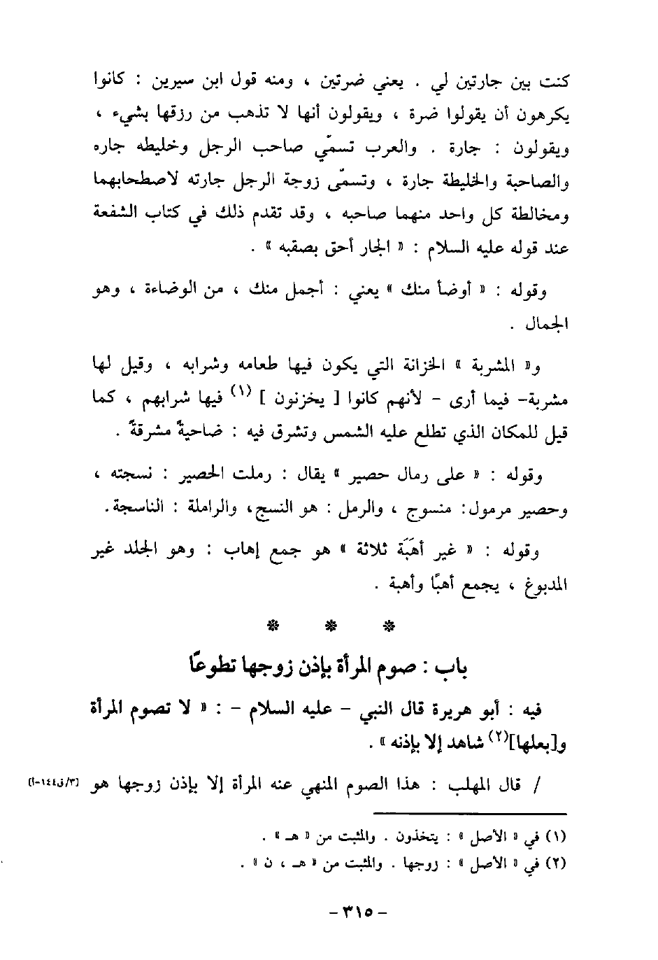 كنت بين جارتين لى، يعنى ضرتين، ومنه قول ابن سيرين: كانوا يكرهون أن يقولوا ضرة، ويقولون: أنها لا تذهب من رزقها بشىء، ويقولون: جارة، والعرب تسمى صاحب الرجل وخليطه جاره والصاحبة والخليطة جارة، وتسمى زوجة الرجل جارته لاصطحابهما ومخالطة كل واحد منهما صاحبه، وقد تقدم ذلك فى كتاب الشفعة عند قوله عليه السلام: الجار أحق بصقبه. وقوله: أوضأ منك، يعنى أجمل منك، من الوضاءة، وهو الجمال. والمشربة الخزانة التى يكون فيها طعامه وشرابه، وقيل لها: مشربة، فيما أرى؛ لأنهم كانوا يخزنون فيها شرابهم، كما قيل للمكان الذى تطلع عليه الشمس وتشرق فيه: ضاحية مشرقة. وقوله: على رمال حصير، يقال: رملت الحصير: نسجته، وحصير مرمول: منسوج، والرمل: هو النسج، والراملة: الناسجة. وقوله: غير أهبة ثلاثة، هو جمع إهاب، وهو الجلد غير المدبوغ، يجمع أهبًا وأهبة.