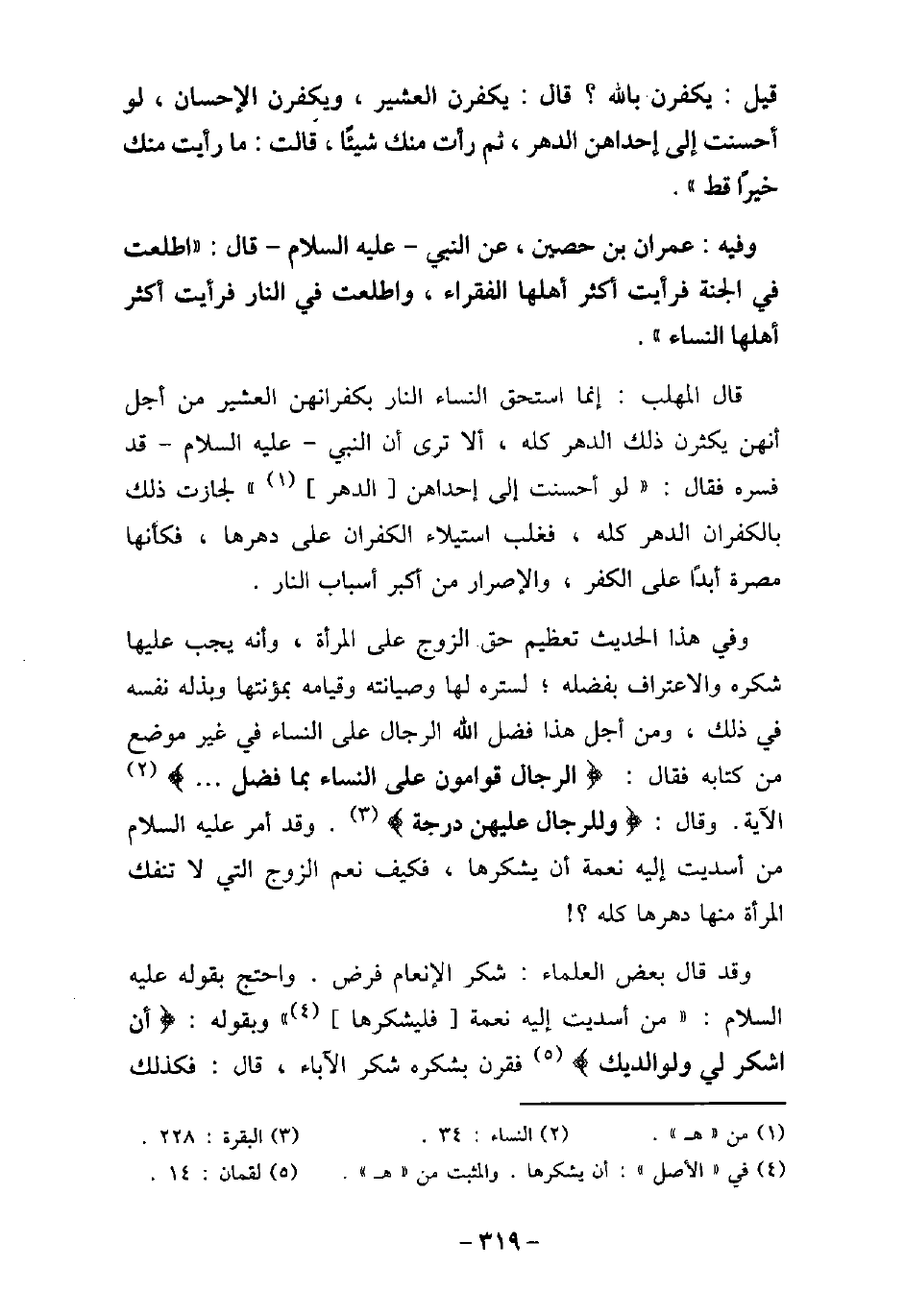 قِيلَ: يَكْفُرْنَ بِاللَّهِ؟ قَالَ: (يَكْفُرْنَ الْعَشِيرَ، وَيَكْفُرْنَ الإحْسَانَ، لَوْ أَحْسَنْتَ إِلَى إِحْدَاهُنَّ الدَّهْرَ، ثُمَّ رَأَتْ مِنْكَ شَيْئًا، قَالَتْ: مَا رَأَيْتُ مِنْكَ خَيْرًا قَطُّ) . / 87 - وفيه: عِمْرَانَ بن حصين، عَنِ النَّبِىِّ، عَلَيْهِ السَّلام، قَالَ: (اطَّلَعْتُ فِى الْجَنَّةِ، فَرَأَيْتُ أَكْثَرَ أَهْلِهَا الْفُقَرَاءَ، وَاطَّلَعْتُ فِى النَّارِ، فَرَأَيْتُ أَكْثَرَ أَهْلِهَا النِّسَاءَ) . قال المهلب: إنما استحق النساء النار بكفرانهن العشير من أجل أنهن يكثرن ذلك الدهر كله، ألا ترى أن النبى، عليه السلام، قد فسره، فقال: (لو أحسنت إلى إحداهن الدهر) ، لجازت ذلك بالكفران الدهر كله، فغلب استيلاء الكفران على دهرها، فكأنها مصرة أبدًا على الكفر، والإصرار من أكبر أسباب النار. وفى هذا الحديث تعظيم حق الزوج على المرأة، وأنه يجب عليها شكره والاعتراف بفضله؛ لستره لها وصيانته وقيامه بمؤنتها وبذله نفسه فى ذلك، ومن أجل هذا فضل الله الرجال على النساء فى غير موضع من كتابه، فقال: (الرجال قوامون على النساء بما فضل) [النساء: 34] الآية، وقال: (وللرجال عليهن درجة) [البقرة: 228] ، وقد أمر عليه السلام من أسديت إليه نعمة أن يشكرها، فكيف نعم الزوج التى لا تنفك المرأة منها دهرها كله؟ وقد قال بعض العلماء: شكر الإنعام فرض. واحتج بقوله عليه السلام: (من أسديت إليه نعمة فليشكرها) ، وبقوله: (أن اشكر لى ولوالديك) [لقمان: 14] ، فقرن بشكره شكر الآباء، قال: فكذلك