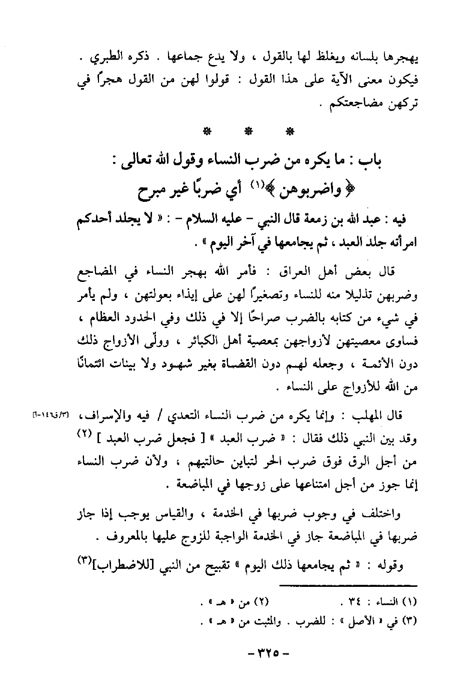 / 93 - فيه: عَبْدِاللَّهِ بْنِ زَمْعَةَ، قَالَ النَّبِىّ، عَلَيْهِ السَّلام: (لا يَجْلِدُ أَحَدُكُمُ امْرَأَتَهُ جَلْدَ الْعَبْدِ، ثُمَّ يُجَامِعُهَا فِى آخِرِ الْيَوْمِ) . قال بعض أهل العراق: فأمر الله بهجر النساء فى المضاجع وضربهن تذليلاً منه للنساء وتصغيرًا لهن على إيذاء بعولتهن، ولم يأمر فى شىء من كتابه بالضرب صراحًا إلا فى ذلك وفى الحدود العظام، فساوى معصيتهن لأزواجهن بمعصية أهل الكبائر، وولى الأزواج ذلك دون الأئمة، وجعله لهم دون القضاة بغير شهود ولا بينات ائتمانًا من الله للأزواج على النساء. قال المهلب: وإنما يكره من ضرب النساء التعدى فيه والإسراف، وقد بين النبى (صلى الله عليه وسلم) ذلك، فقال: (ضرب العبد) ، فجعل ضرب العبد من أجل الرق فوق ضرب الحر لتباين حالتيهم، ولأن ضرب النساء إنما جوز من أجل امتناعها على زوجها فى المباضعة. واختلف فى وجوب ضربها فى الخدمة، والقياس يوجب إذا جاز ضربها فى المباضعة جاز فى الخدمة الواجبة للزوج عليها بالمعروف. وقوله: (ثم يجامعها ذلك اليوم) ، تقبيح من النبى (صلى الله عليه وسلم) للاضطراب