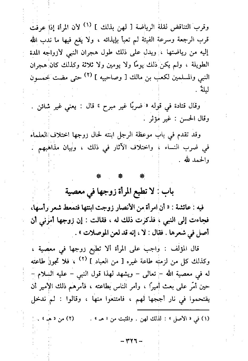 وقرب التناقض لقلة الرياضة لهن بذلك؛ لأن المرأة إذا عرفت قرب الرجعة وسرعة الفيئة لم تعبأ بإيذائه، ولا يقع فيها ما ندب الله إليه من رياضتها، ويدل على ذلك طول هجران النبى (صلى الله عليه وسلم) لأزواجه المدة الطويلة، ولم يكن ذلك يومًا ولا يومين ولا ثلاثة، وكذلك كان هجران النبى (صلى الله عليه وسلم) والمسلمين لكعب بن مالك وصاحبيه حتى مضت خمسون ليلة. وقال قتادة فى قوله: (ضربًا غير مبرح) ، قال: يعنى غير شائن، وقال الحسن: غير مؤثر. وقد تقدم فى باب موعظة الرجل ابنته لحال زوجها اختلاف العلماء فى ضرب النساء، واختلاف الآثار فى ذلك، وبيان مذاهبهم، والحمد لله.