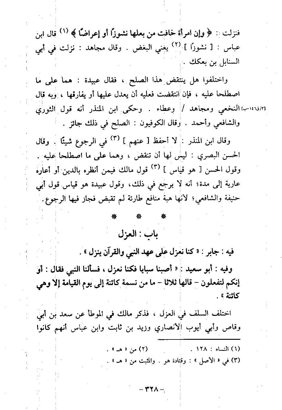 / 96 - فيه: جَابِر، كُنَّا نَعْزِلُ عَلَى عَهْدِ النَّبِىِّ (صلى الله عليه وسلم) ، وَالْقُرْآنُ يَنْزِلُ. / 97 - وفيه: أَبُو سَعِيد، أَصَبْنَا سَبْيًا، فَكُنَّا نَعْزِلُ، فَسَأَلْنَا النَّبِىّ (صلى الله عليه وسلم) ، فَقَالَ: (أَوَإِنَّكُمْ لَتَفْعَلُونَ؟ قَالَهَا ثَلاثًا، مَا مِنْ نَسَمَةٍ كَائِنَةٍ إِلَى يَوْمِ الْقِيَامَةِ إِلا وَهِىَ كَائِنَةٌ) . اختلف السلف فى العزل، فذكر مالك فى الموطأ، عن سعد بن أبى وقاص، وأبى أيوب الأنصارى، وزيد بن ثابت، وابن عباس، أنهم كانوا